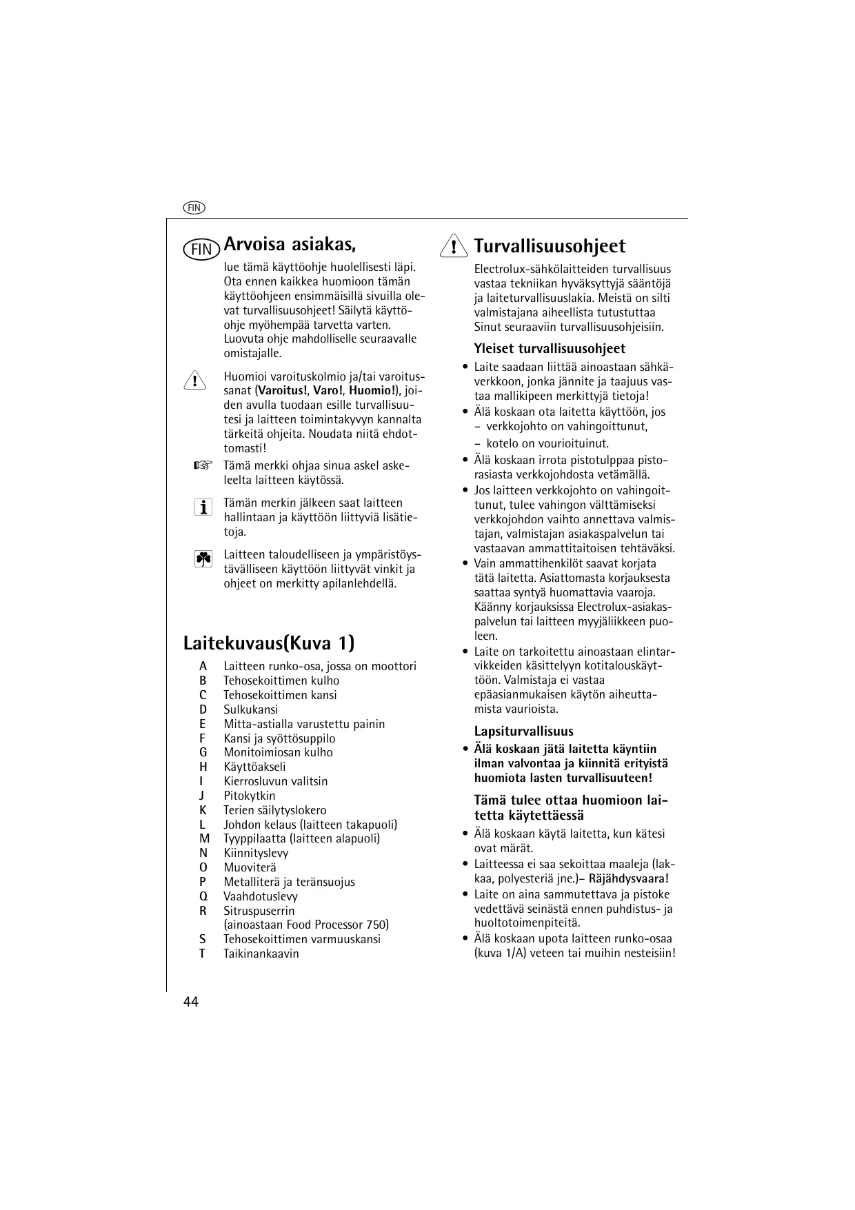 Laite on tarkoitetti ainoastaan elintarvikkeiden kasittelyyn kotitalouskayttoon. Valmistaja ei vastaa epaasianmukaisen kayton aiheuttamista vauroiasta.