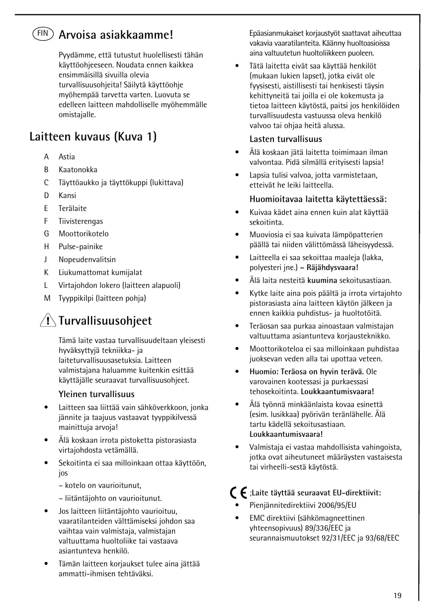 ise sti täh än k äyttöoh je e se e n. Noudata e nne n k aik k e a e nsim m äisil ä sivuil a ol e via turval isuusoh je ita! Säil ytä k äyttöoh je m yöh e m pää tarve tta varte n. Luovuta se e de l een l aitte e n m ah dol ise l e m yöh e m m äl