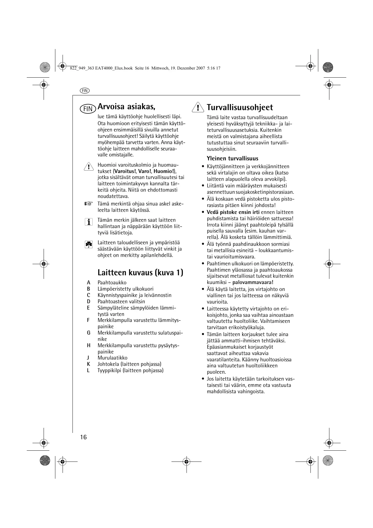 Huomioi varoituskolmio ja huomautukset (Varoitus!, Varo!, Huomio!), jotka sisälätvät Oman turballisuutesi tai laitteen tointakvyn kannalta tärkeitä ohjeita. Niitta on ehdottomasti noudatettava.
