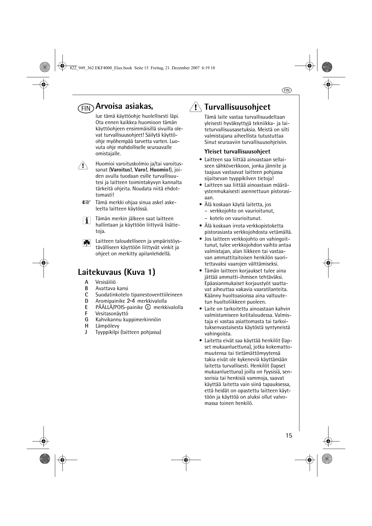 Turvallisuusohjeet Tämä laite vastaa turvallisuudeltaan vleisesti hyväksyttyjà tekniikka- ja lai- teturvallisuusasetuksia. Meistä on silti valmistajana aiheellista tutustuttaa Sinut seuraaviin turvallisuusohjeisiin. Yleiset turvallisuusohjeet Laitteen saa liittää ainoastaan sellai- seen sähkôverkkoon, jonka jännite ja taajuus vastaavat laitteen pohjassa sijaitsevan tyyppikilven tietojal Laitteen saa liittää ainoastaan määrä- ystenmukaisesti asennettuun pistorasi- aan. Âlä koskaan käytä laitetta, jos — verkkojohto on vaurioitunut, - kotelo on vaurioitunut. Alä koskaan irrota verkkopistoketta pistorasiasta verkkojohdosta vetämällä. Jos laitteen verkkojohto on vahingoit- tunut, tulee verkkojohdon vaihto antaa valmistajan, alan liikkeen tai vastaa- van ammattitaitoisen henkilôn suori- tettavaksi vaarojen välttämiseksi. Tämän laitteen korjaukset tulee aina jättää ammatti-ihmisen tehtäväksi. Epäasianmukaiset korjaustyôt saatta- vat aiheuttaa vakavia vaaratilanteita. Käänny huoltoasioissa aina valtuute- tun huoltoliikkeen puoleen. Laite on tarkoitettu ainoastaan kahvin valmistamiseen kotitaloudessa. Valmis- taja ei vastaa asiattomasta tai tarkoi- tuksenvastaisesta Käytôstä syntyneistä vahingoista. Laitetta eivät saa Käyttää henkilôt (lap- set mukaanluettuna), jotka kokematto- muutensa tai tietämättômyytensä takia eivät ole kykeneviä käyttämään laitetta turvallisesti. Henkilôt (lapset mukaanluettuna) joilla on fyysisiä, sen- sorisia tai henkisiä vammoja, saavat käyttää laitetta vain siinä tapauksessa, että heidät on opastettu laitteen käyt- +6ûn ja Käyttôä on aluksi ollut valvo- massa toinen henkilô.