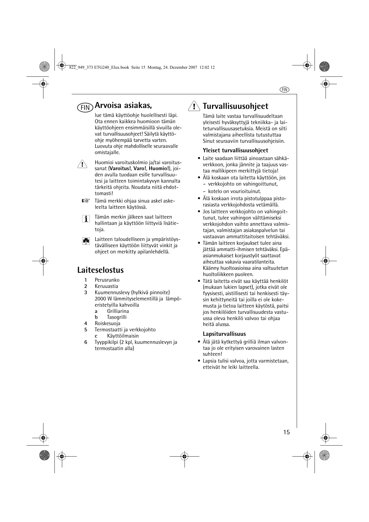 , joka on merkitty tuotSymboli teeseen tai sen pakkaukseen, osoittaa, että tätä tuotetta ei saa käsitellä talousjätteenä. Tuote on sen sijaan luovutettava sopivaan sähkö- ja elektroniikkalaitteiden kierrätyksestä huolehtivaan keräyspisteeseen. Tämän tuotteen asianmukaisen hävittämisen varmistamisella autetaan estämään sen mahdolliset ympäristöön ja terveyteen kohdistuvat haittavaikutukset, joita voi aiheutua muussa tapauksessa tämän tuotteen epäasianmukaisesta jätekäsittelystä. Tarkempia tietoja tämän tuotteen kierrättämisestä saa paikallisesta kunnantoimistosta, talousjätehuoltopalvelusta tai liikkeestä, josta tuote on ostettu. 822_949_373 ETG240_Elux.book Seite 17 Montag, 24. Dezember 2007 12:02 12