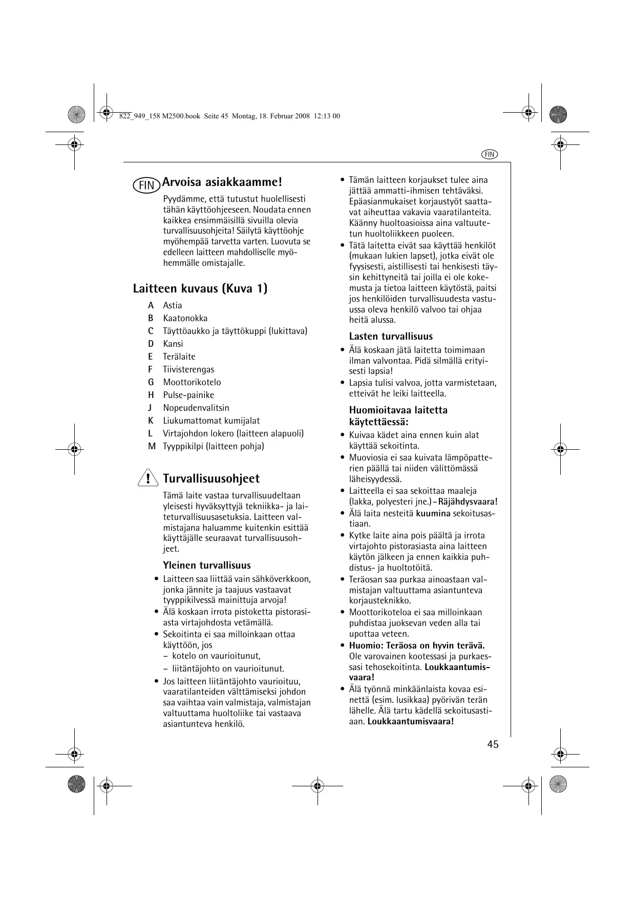 Astia Kaatonokka Täyttöaukko ja täyttökuppi (lukittava) Kansi Terälaite Tiivisterengas Moottorikotelo Pulse-painike Nopeudenvalitsin Liukumattomat kumijalat Virtajohdon lokero (laitteen alapuoli) Tyyppikilpi (laitteen pohja) 1 Turvallisuusohjeet Tämä laite vastaa turvallisuudeltaan yleisesti hyväksyttyjä tekniikka- ja laiteturvallisuusasetuksia. Laitteen valmistajana haluamme kuitenkin esittää käyttäjälle seuraavat turvallisuusohjeet. Yleinen turvallisuus