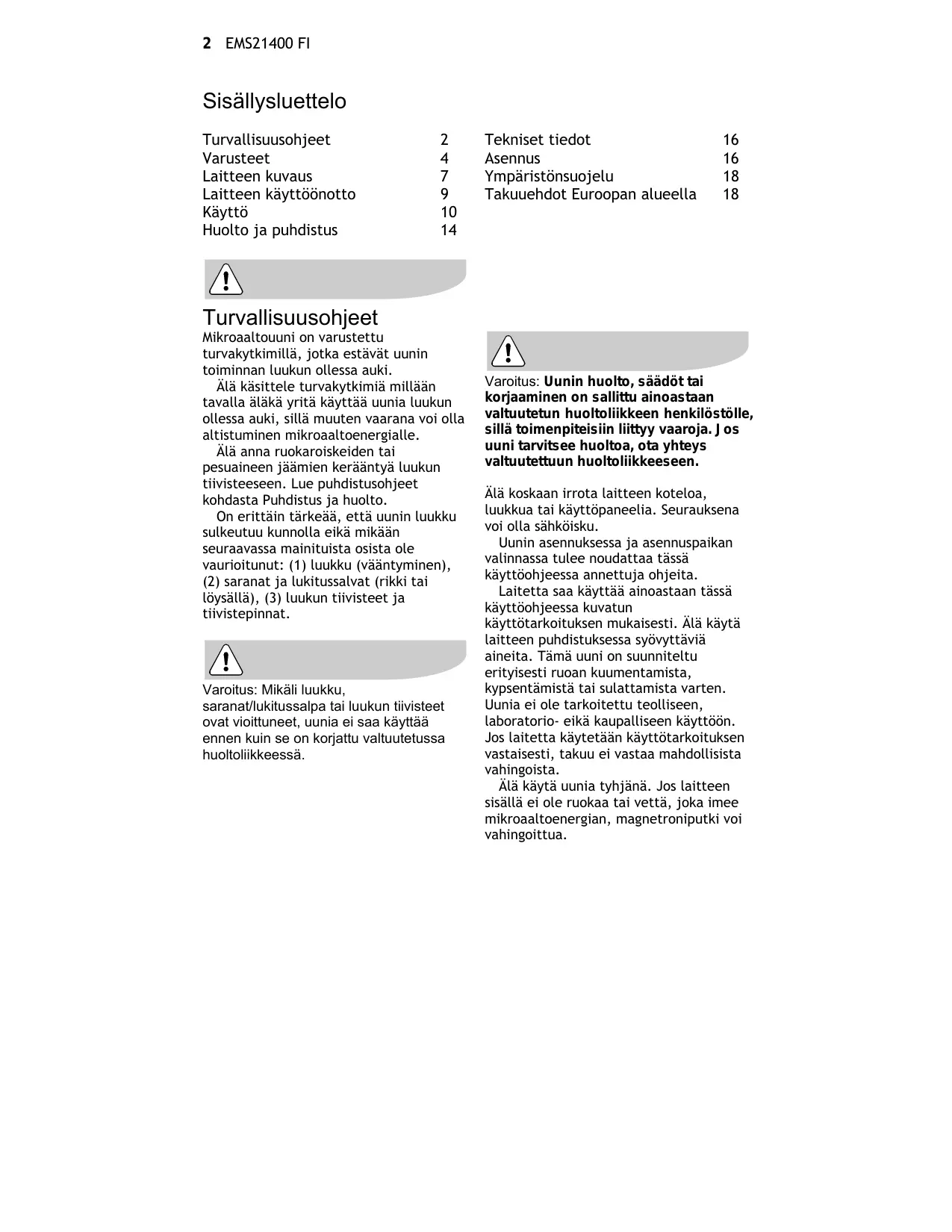 2 EMS21400 FI Sisällysluettelo Turvallisuusohjeet Varusteet Laitteen kuvaus Laitteen käyttüünotto Käyttô Huolto ja puhdistus