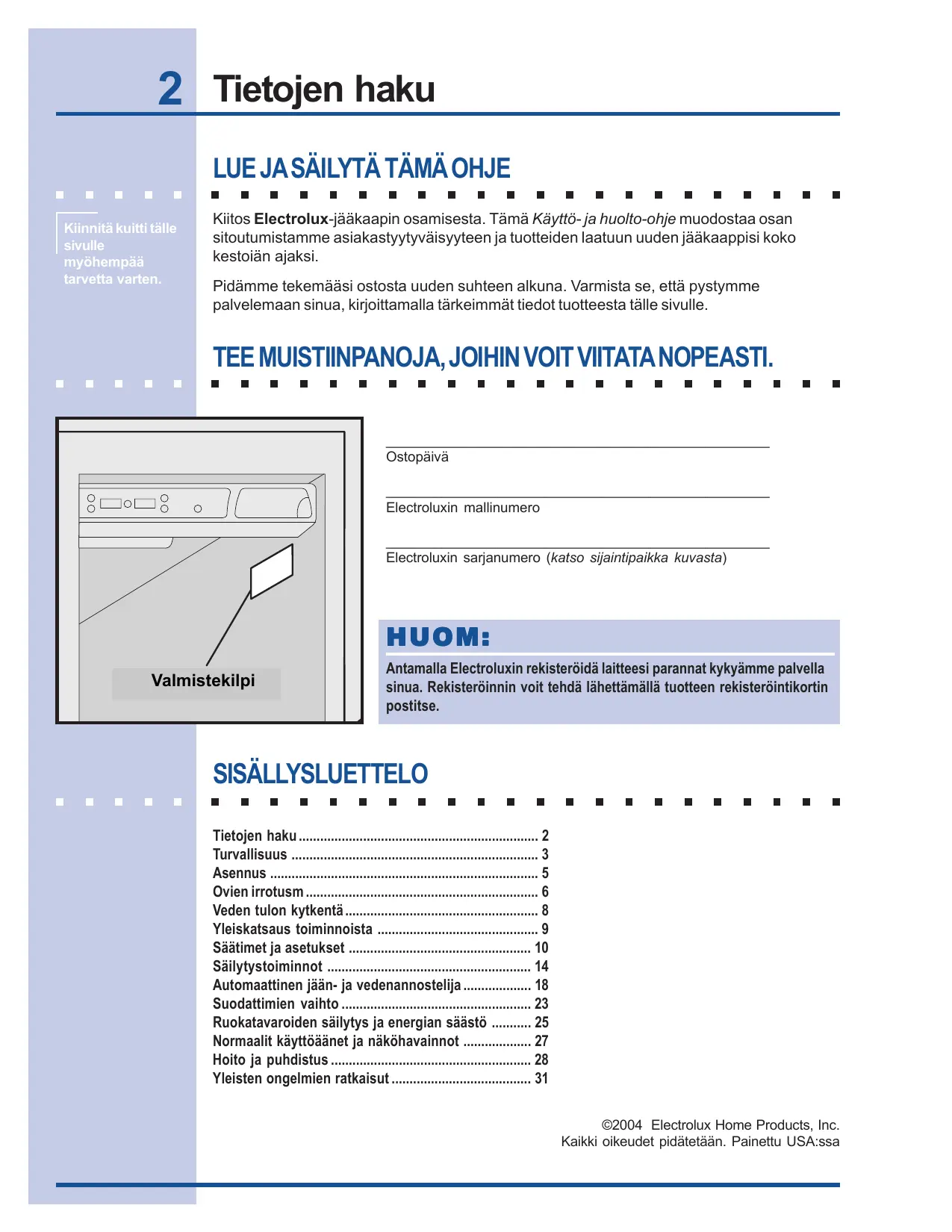 ©2004 Electrolux Home Products, Inc. Kaikki oikeudet pidätetään. Painettu USA:ssa