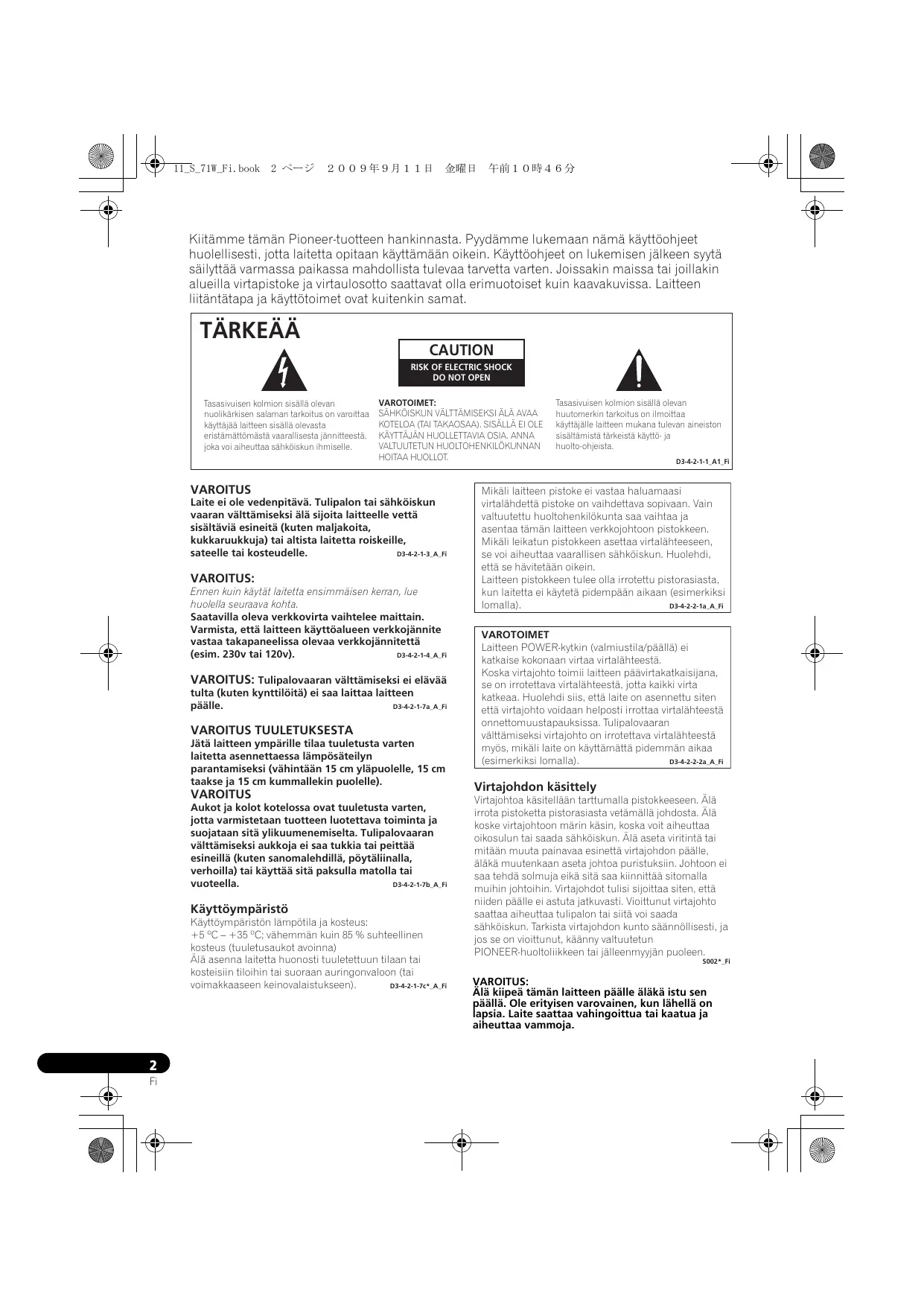 Virtajohdon käsittely Virtajohtoa käsitellään tarttumalla pistokkeeseen. Älä irrota pistoketta pistorasiasta vetämällä johdosta. Älä koske virtajohtoon märin käsin, koska voit aiheuttaa oikosulun tai saada sähköiskun. Älä aseta viritintä tai mitään muuta painavaa esinettä virtajohdon päälle, äläkä muutenkaan aseta johtoa puristuksiin. Johtoon ei saa tehdä solmuja eikä sitä saa kiinnittää sitomalla muihin johtoihin. Virtajohdot tulisi sijoittaa siten, että niiden päälle ei astuta jatkuvasti. Vioittunut virtajohto saattaa aiheuttaa tulipalon tai siitä voi saada sähköiskun. Tarkista virtajohdon kunto säännöllisesti, ja jos se on vioittunut, käänny valtuutetun PIONEER-huoltoliikkeen tai jälleenmyyjän puoleen. S002*_Fi