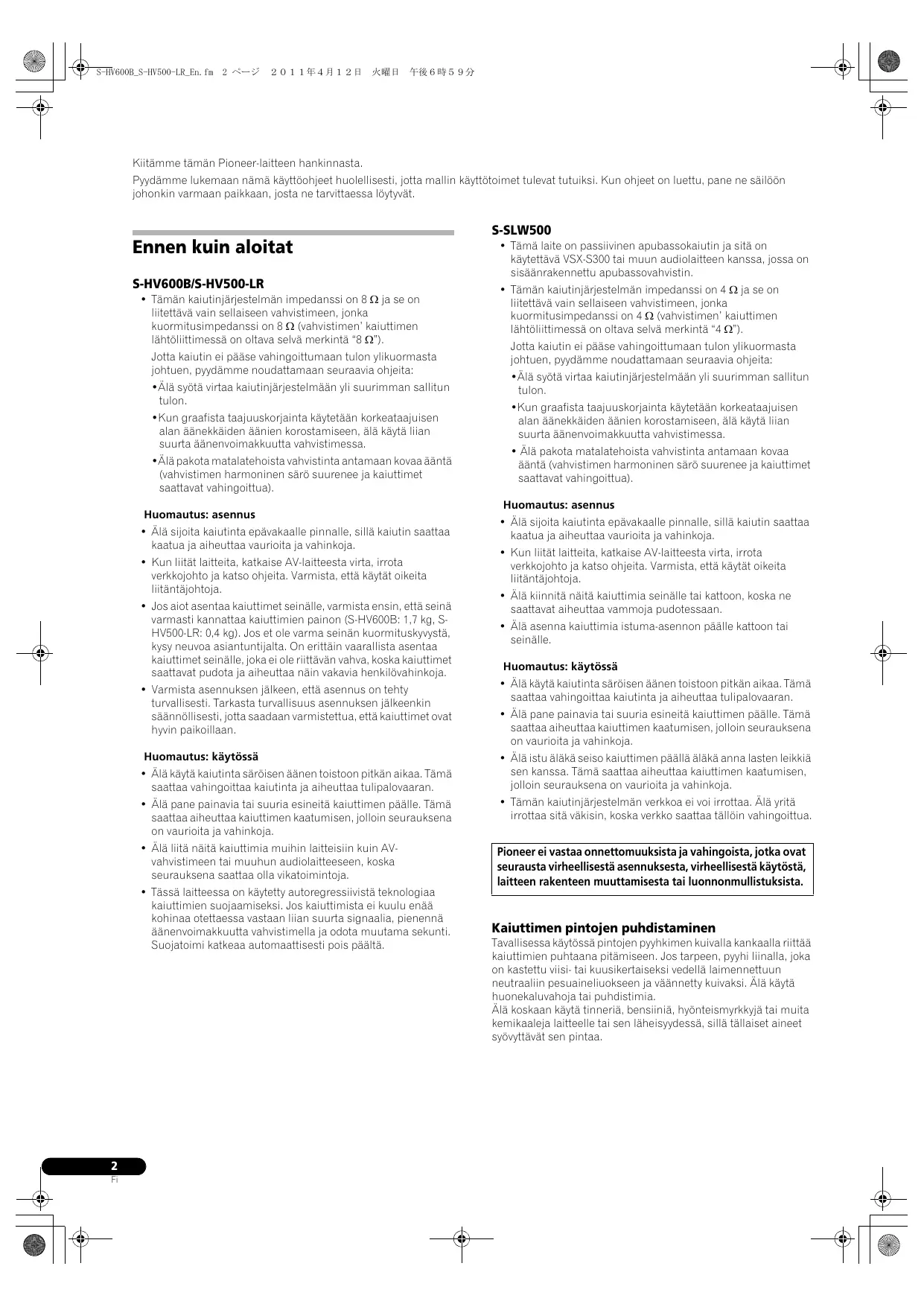 • Mallin S-HV500-LR varusteisiin kuuluu kaksi kaiutinjärjestelmää per pakkaus. • Parannusten vuoksi pidätämme oikeuden muuttaa teknisiä ominaisuuksia ja ulkoasua ilman erillistä ilmoitusta. * Koska nämä kaiuttimet antavat äänen kummaltakin puolelta, äänilähtö on kaksinkertainen. Äänenvoimakkuus on sama kuin 82 dB tavallisilla kaiuttimilla. © 2011 PIONEER CORPORATION. Kaikki oikeudet pidätetään.