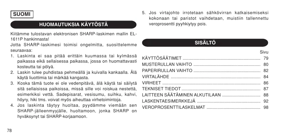 KÄYTTÖOHJE EL1611P SHARP