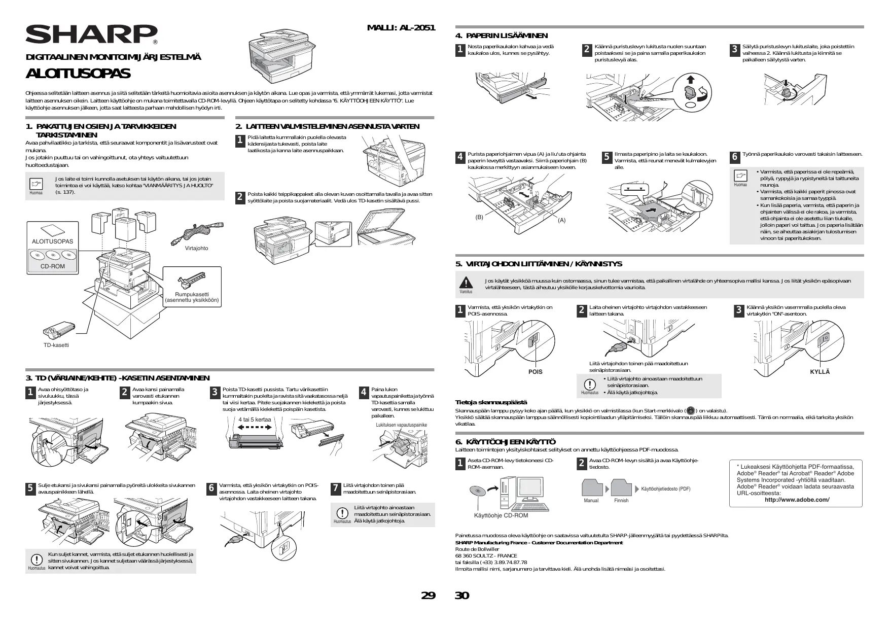 Käyttöohje CD-ROM Painetussa muodossa oleva käyttöohje on saatavissa valtuutetulta SHARP-jälleenmyyjältä tai pyydettäessä SHARPilta. SHARP Manufacturing France - Customer Documentation Department Route de Bollwiller 68 360 SOULTZ - FRANCE tai faksilla (+33) 3.89.74.87.78 Ilmoita mallisi nimi, sarjanumero ja tarvittava kieli. Älä unohda lisätä nimeäsi ja osoitettasi.