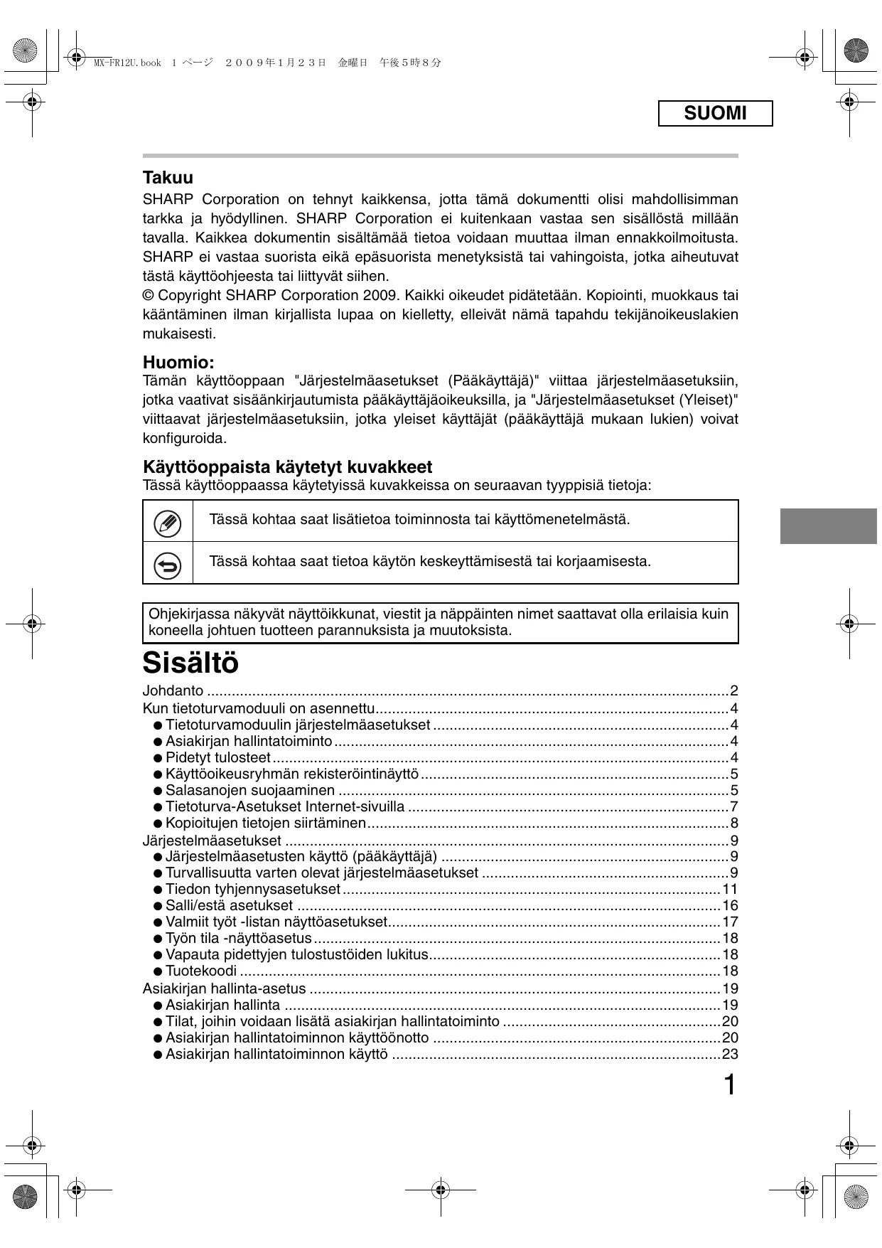 - SUOMI Takuu SHARP Corporation on tehnyt kaikkensa, jotta tämä dokumentti olisi mahdollisimman tarkka ja hyödyllinen. SHARP Corporation ei kuitenkaan vastaa sen sisällöstä millään tavalla. Kaikkea dokumentin sisältämää tietoa voidaan muuttaa ilman ennakkoilmoitusta. SHARP ei vastaa suorista eikä epäsuorista menetyksistä tai vahingoista, jotka aiheutuvat tästä käyttöohjeesta tai liittyvät siihen. © Copyright SHARP Corporation 2009. Kaikki oikeudet pidätetään. Kopiointi, muokkaus tai kääntäminen ilman kirjallista lupaa on kielletty, elleivät nämä tapahdu tekijänoikeuslakien mukaisesti. Huomio: Tämän käyttöoppaan "Järjestelmäasetukset (Pääkäyttäjä)" viittaa järjestelmäasetuksiin, jotka vaativat sisäänkirjautumista pääkäyttäjäoikeuksilla, ja "Järjestelmäasetukset (Yleiset)" viittaavat järjestelmäasetuksiin, jotka yleiset käyttäjät (pääkäyttäjä mukaan lukien) voivat konfiguroida. Käyttöoppaista käytetyt kuvakkeet Tässä käyttöoppaassa käytetyissä kuvakkeissa on seuraavan tyyppisiä tietoja: Tässä kohtaa saat lisätietoa toiminnosta tai käyttömenetelmästä. Tässä kohtaa saat tietoa käytön keskeyttämisestä tai korjaamisesta. Ohjekirjassa näkyvät näyttöikkunat, viestit ja näppäinten nimet saattavat olla erilaisia kuin koneella johtuen tuotteen parannuksista ja muutoksista. Sisältö Johdanto p. 2