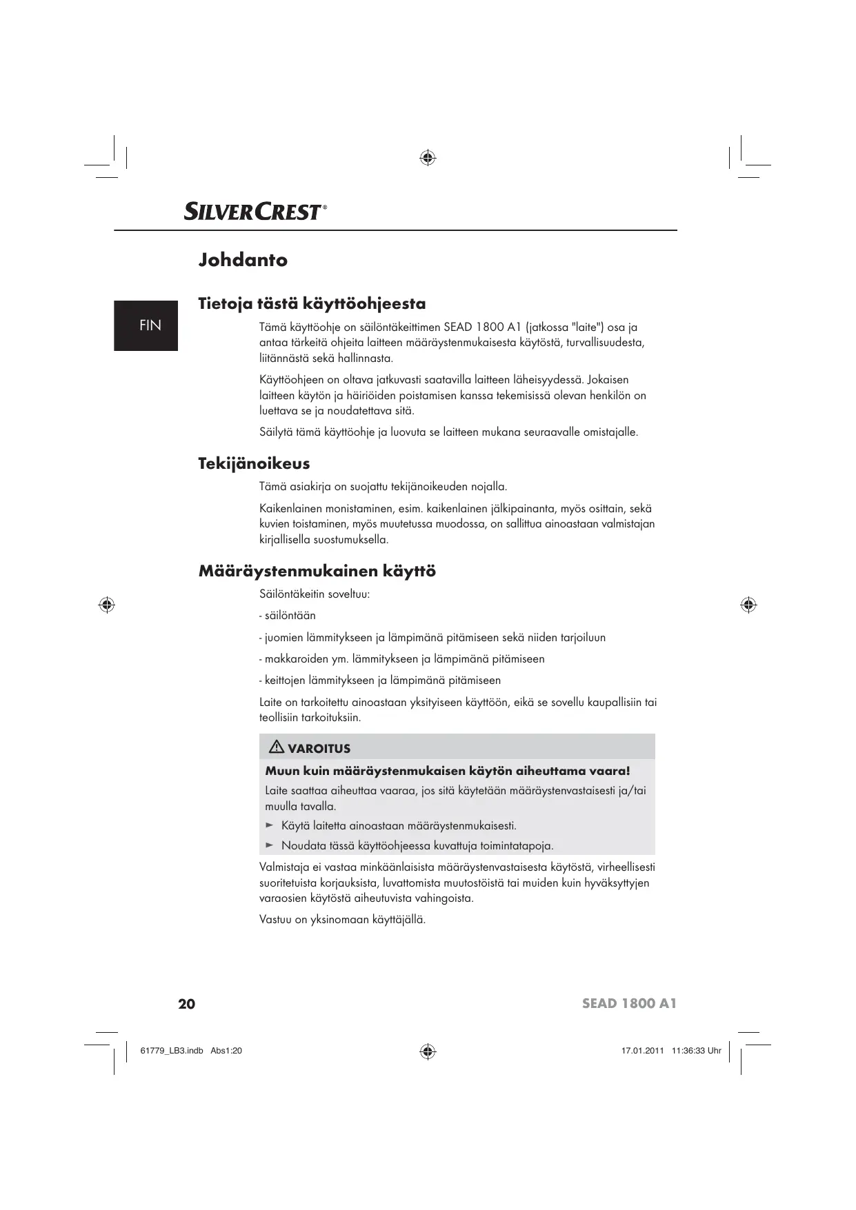SILVERCREST‘ Johdanto Tietoja tästä käyttôohjeesta FIN Tämä käyttôohje on säilôntäkeittimen SEAD 1800 AT (jatkossa "laite") osa ja antaa tärkeitä ohjeita laitteen määräystenmukaisesta käytôstä, turvallisuudesta, litännästä sekä hallinnasta: Käytiéohjeen on oltava jaïkuvasti saatavilla laitteen läheisyydessä. Jokaisen laitteen käytôn ja häiriëiden poistamisen kanssa tekemisissä olevan henkilôn on luettava se ja noudatettava sitä. Säilytä tämä käyttéohje ja luovuta se laiteen mukana seuraavalle omistajalle. Tekijänoikeus Tämä asiakirja on suojattu tekijänoikeuden nojalla Kaïkenlainen monistaminen, esim. kaïkenlainen jälkipainanta, myës ositiain, sekä kuvien toistaminen, myôs muutetussa muodossa, on sallitua ainoastaan valmistajan kirjallisella suostumuksella. Määräystenmukainen käyttô