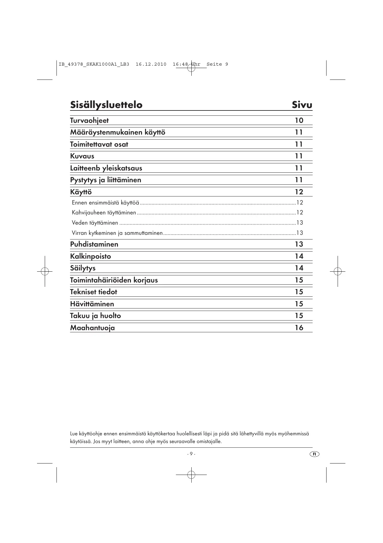 Puhdistaminen 13 Kalkinpoisto 14 Säilytys 14 Toimintahäiriôiden korjaus 15 Tekniset tiedot 15 Hävittäminen 15 Takuu ja huolto 15 Maahantuoja 16