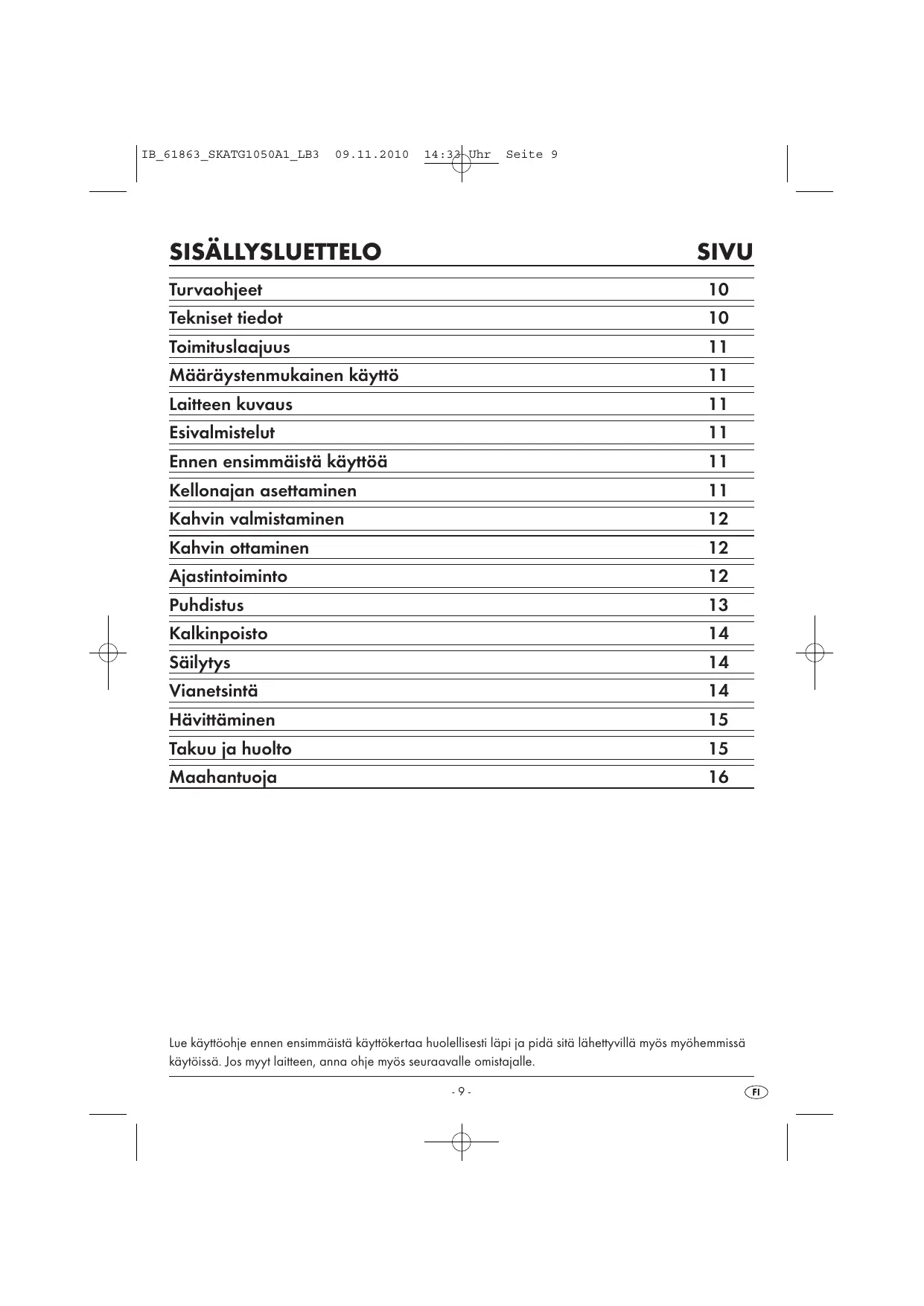SISÂLLYSLUETTELO SIVU Turvachijeet 10 Tekniset tiedot 10 Toimituslaajuus 11 Määräystenmukainen käyttô 11 Laitteen kuvaus 11 Esivalmistelut 11 Ennen ensimmäistä käyttoä 11 Kellonajan asettaminen 11 Kahvin valmistaminen 12 Kahvin ottaminen 12 Ajastintoiminto 12 Puhdistus 13 Kalkinpoisto 14 h an | Säilytys 14 | Vianetsintä 14 Hävittäminen 15 Takuu ja huolto 15 Maahantuoja 16