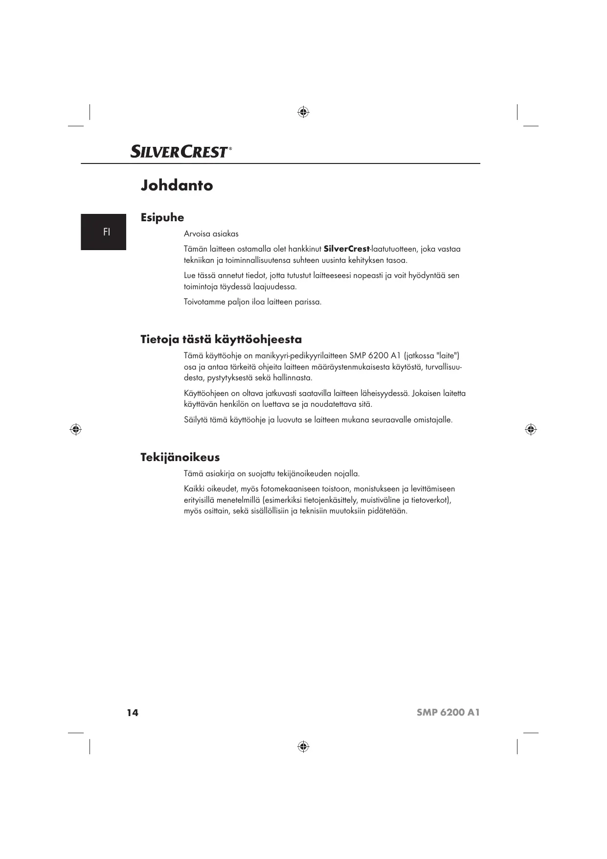 Tämä käyttohje on manikyyri-pedikyyrilaitteen SMP 6200 A1 [jatkossa "laite"} osa ja antaa tärkeitä ohjeita laitteen määräystenmukaisesta käytôstä, turvallisuu- desta, pystytyksestä sekä hallinnasta.