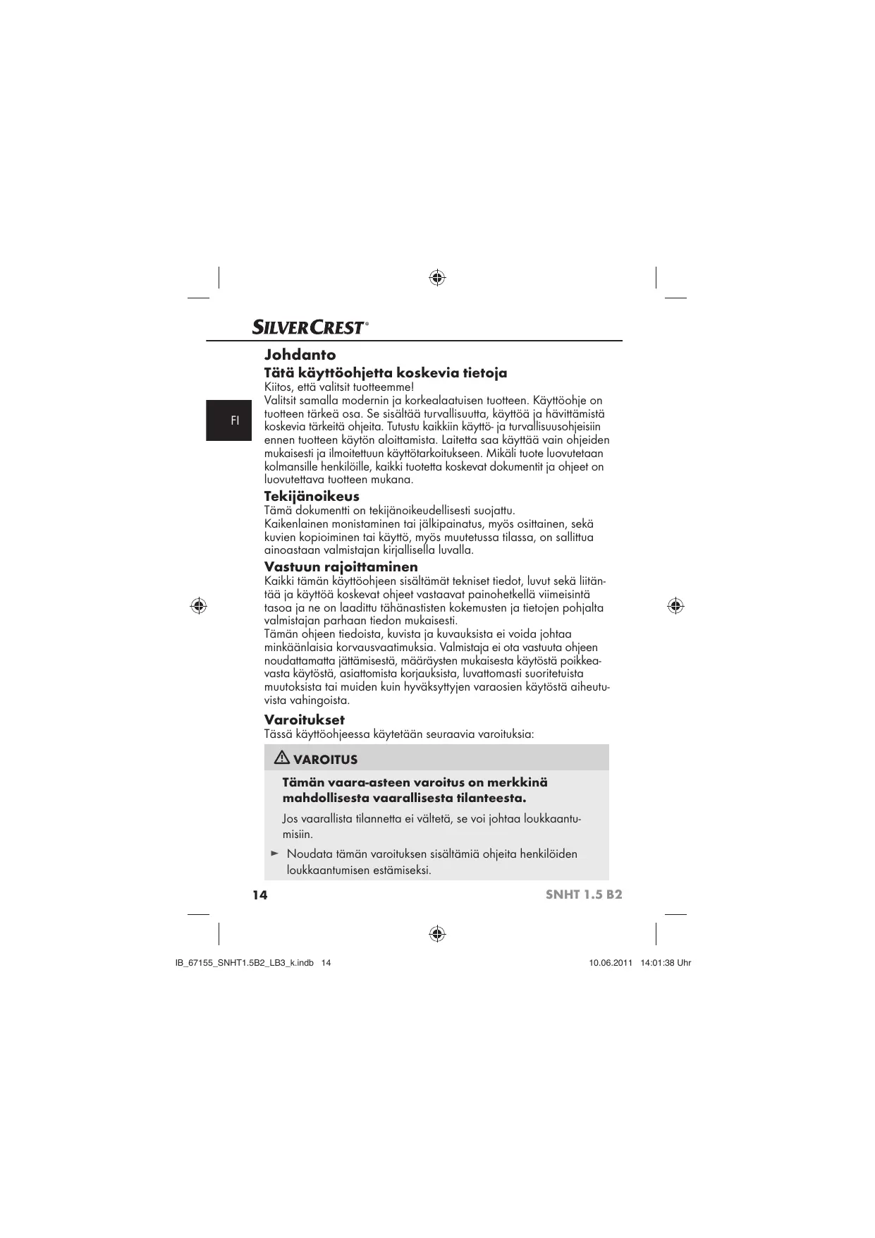 SILVERCREST‘ Johdanto Tätä käyttôohjetta koskevia tietoja Kiitos, että valitsit tuotteemmel Valitsit samalla modernin ja korkealaatuisen tuotteen. Käyttéohje on tuotteen tärkeä osa. Se sisältää turvallisuutta, käyttôä ja hävittämistä koskevia tärkeitä ohjeita. Tutustu kaikkin käyttô- ja furvalisuusohfe in ennen tuotteen käytôn aloittamista. Laitetta saa käyttää vain ohjeiden mukaïsesti ja ilmoitettuun käytôtarkoitukseen. Mikäli tuote luovutetaan kolmansille henkilôille, kaikki tuoteta koskevat dokumentit ja ohjeet on luovutettava tuotteen mukana Tekijänoikeus Tämä dokumentti on tekijänoikeudellisesti suojattu. Kaïkenlainen monistaminen tai jälkipainatus, myës osittainen, sekä kuvien kopioiminen tai käyhô, myôs muutetussa tilassa, on sallittua ainoastaan valmistajan kirjallisella luvalla. Vastuun rajoittaminen Kaiïkki tämän käyttéohjeen sisältämät tekniset tiedot, luvut sekä liitän- täà ja käyttôä koskevat ohjeet vastaavat painohetkellä viimeisintä tasoa ja ne on laadittu tähänastisten kokemusten ja tietojen pohjalta 2 valmistajan parhaan tiedon mukaisesti. Tämän ohjeen tiedoista, kuvista ja kuvauksista ei voida johtaa minkäänlaisia korvausvaatimuksia. Valmistaja ei ota vastuuta ohjeen noudattamatia jättämisestä, määräysten mukaisesta käytôstä poikkea- vasta käytôstä, asiattomista korjauksista, luvattomasti suoritetuista muutoksista tai muiden kuin hyväksyttyjen varaosien käytôstä aiheutu- vista vahingoista. Varoitukset Tässä käyttéohjeessa käytetään seuraavia varoituksiar: À VAROITUS Tämän vaara-asteen varoitus on merkkinä mahdollisesta vaarallisesta tilanteesta. Jos vaarallista tilannetta ei vältetä, se voi johtaa loukkaantu- misiin. > Noudata tämän varoituksen sisältämiä ohjeita henkilôiden loukkaantumisen estämiseksi. 14 SNHT 1.5 B2 1B_67155_SNHT1.582_LB3 kindb 14 10.06.2011 14:01:38 Uhr