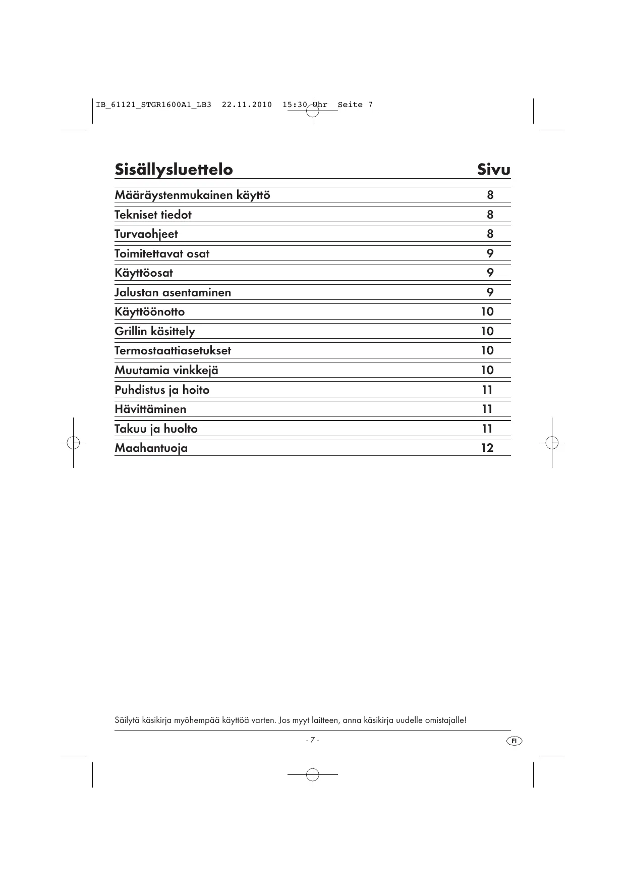 Sisällysluettelo Sivu Määräystenmukainen käyttô 8 Tekniset tiedot 8 Turvachijeet 8 Toimitettavat osat 9 Käytt6osat 9 Jalustan asentaminen 9 Käytt6ônotto 10 Grillin käsittely 10 Termostaattiasetukset 10 Muutamia vinkkejä 10 Puhdistus ja hoito ul Hävittäminen 1 Takuu ja huolto LL Maahantuoja 12 Säilytä käsikirja myôhempää käyttôä varten. Jos myyt laitteen, anna käsikirja uudelle omistajallel -7- (co) Pan