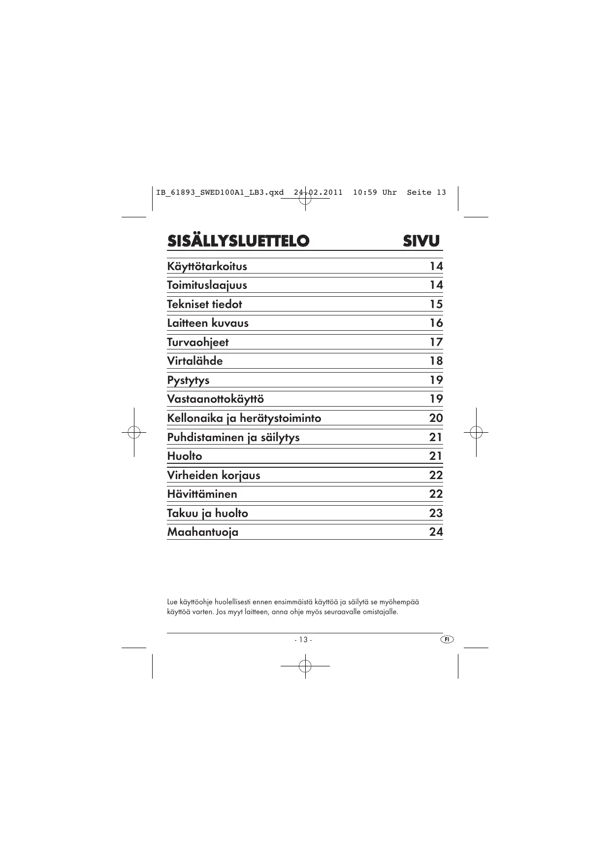 Käyttôtarkoitus 14 Toimituslaajuus 14 Tekniset tiedot 15 Laitteen kuvaus 16 Turvachijeet 17 Virtalähde 18 Pystytys 19 Vastaanottokäytitô 19 Kellonaïka ja herätystoiminto 20 Puhdistaminen ja säilytys 21 Huolto 21 Virheiden korjaus 22 Hävittäminen 22 Takuu ja huolto 23 Maahantuoja 24 Lue käytSohje huolellisest ennen ensimmäistä käy#éë ja säilyté se myShempää Käyt5ä varten. Jos myyt laiteen, anna ohje myës seuraavalle omistajalle