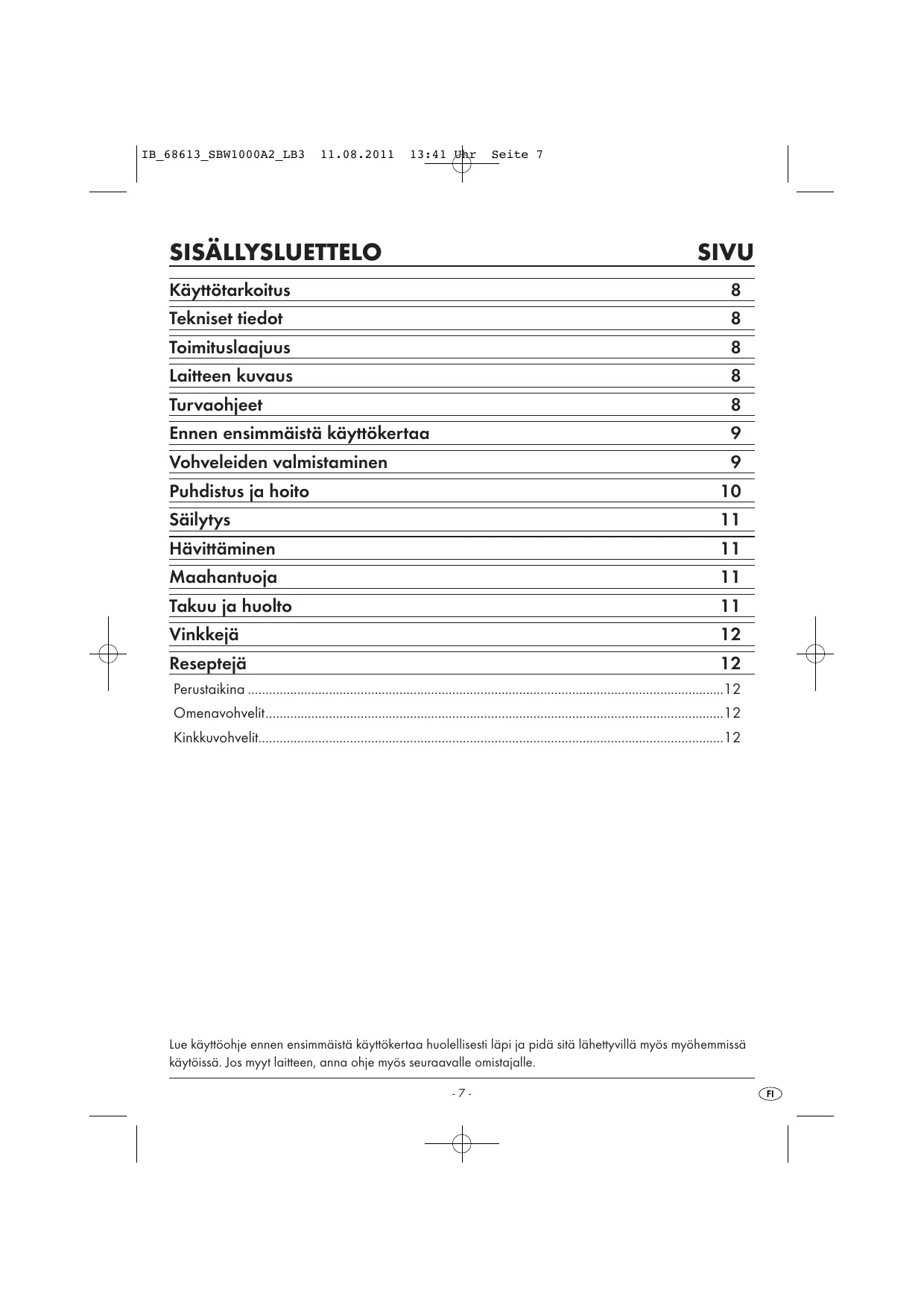 lytys 1 de Seite 11 Takuu ja huolto Ennen kuin sirrät laitteen syrjään, anna sen ensin jäähtyä kokonaan. Kierrä laitteen virtajohto sen alapuolella olevaan pidikkeeseen. Säilytà laitetta kuivassa paikassa. Hävittäminen à laitetta tavallisen talousjätteen mukana. Tämä tuote on eurooppalaisen mm direktiivin 2002/96/EC mukainen. Anna laite hyväksytyn jätehuoltoyrityksen tai kunnal- lisen jätelaitoksen hävitettäväksi. Noudata voimassa olevia määräyksiä. Epäselvissä tilanteissa ota yhteyttä paikalliseen jätehuoltoviranomaiseen.