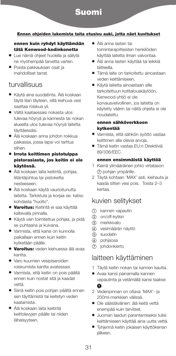 Älä anna lasten tai toimintarajoitteisten henkilöiden käyttää laitetta ilman valvontaa. Älä anna lasten käyttää tai leikkiä laitteella. Tämä laite on tarkoitettu ainoastaan veden keittämiseen. Käytä laitetta ainoastaan sille tarkoitettuun kotitalouskäytöön. Kenwood-yhtiö ei ole korvausvelvollinen, jos laitetta on käytetty väärin tai näitä ohjeita ei ole noudatettu. ennen sähköverkkoon kytkentää Varmista, että sähkön syöttö vastaa keittimen alla olevia arvoja. Tämä keitin vastaa EU:n Direktiiviä 89/336/EEC. ennen ensimmäistä käyttöä 1 Kierrä ylimääräinen johto virtatason pohjan ympärille. 2 Täytä kohtaan ’MAX’ asti, kiehauta ja kaada sitten vesi pois. Toista 2–3 kertaa. kuvien selitykset kannen vapautin on/off-kytkin merkkivalo vesimäärän näyttö suodatin pohjaosa johdonkierto laitteen käyttäminen 1 Täytä keitin nokan tai kannen kautta. ● Avaa kansi painamalla kannen vapautinta ja vetämällä kansi taakse 2 Vedenpinnan on oltava ’MAX’- ja 200ml-merkkien välissä. ● Ole säästäväinen: älä keitä vettä enempää kuin tarvitset. ● Juoman laadun parantamiseksi tulisi keittämiseen käyttää aina uutta vettä. ● Tyhjennä keitin jokaisen käyttökerran jälkeen.