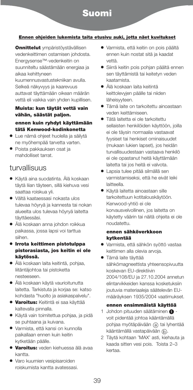 Varmista, että keitin on pois päältä ennen kuin nostat sitä ja kaadat vettä. Siirrä keitin pois pohjan päältä ennen sen täyttämistä tai keitetyn veden kaatamista. Älä koskaan laita keitintä keittolevyjen päälle tai niiden läheisyyteen. Tämä laite on tarkoitettu ainoastaan veden keittämiseen. Tätä laitetta ei ole tarkoitettu sellaisten henkilöiden käyttöön, joilla ei ole täysin normaalia vastaavat fyysiset tai henkiset ominaisuudet (mukaan lukien lapset), jos heidän turvallisuudestaan vastaava henkilö ei ole opastanut heitä käyttämään laitetta tai jos heitä ei valvota. Lapsia tulee pitää silmällä sen varmistamiseksi, että he eivät leiki laitteella. Käytä laitetta ainoastaan sille tarkoitettuun kotitalouskäytöön. Kenwood-yhtiö ei ole korvausvelvollinen, jos laitetta on käytetty väärin tai näitä ohjeita ei ole noudatettu. ennen sähköverkkoon kytkentää Varmista, että sähkön syöttö vastaa keittimen alla olevia arvoja. Tämä laite täyttää sähkömagneettista yhteensopivuutta koskevan EU-direktiivin 2004/108/EU ja 27.10.2004 annetun elintarvikkeiden kanssa kosketuksiin joutuvia materiaaleja säätelevän EUmääräyksen 1935/2004 vaatimukset. ennen ensimmäistä käyttöä 1 Johdon pituuden säätäminen voit pidentää johtoa kääntämällä pohjaa myötäpäivään tai lyhentää kääntämällä vastapäivään . 2 Täytä kohtaan ’MAX’ asti, kiehauta ja kaada sitten vesi pois. Toista 2–3 kertaa.