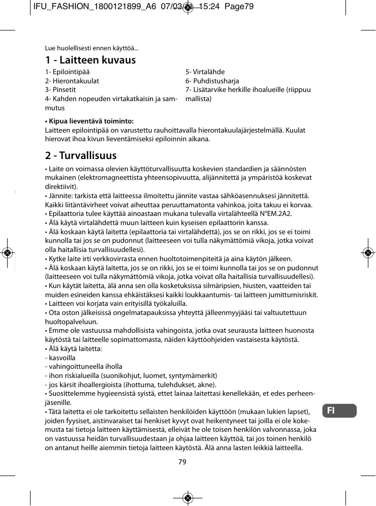 • Ne pas utiliser le bloc d'alimentation pour un autre usage que celui de l'épilateur. • Ne jamais utiliser l'appareil (épilateur ou bloc d'alimentation) s'il est endommagé, en cas d'anomalie de fonctionnement ou après une chute (des dommages non visibles peuvent être préjudiciables à votre sécurité). • Débranchez l’appareil avant toute intervention et après chaque utilisation. • N’utilisez jamais l’appareil s’il est endommagé, en cas d’anomalie de fonctionnement ou après une chute (des dommages non visibles peuvent être préjudiciables à votre sécurité). • Lorsque l’appareil est en marche, il ne doit pas rentrer en contact avec les cils, les cheveux, les vêtements, ou tout autre objet, afin d’éviter tout risque de blessure ou de blocage de l’appareil. • Cet appareil n’est réparable qu’à l’aide d’outils spéciaux. • Pour tout problème d’après-vente, adressez-vous à votre revendeur habituel ou à un Centre de Service agréé. • Nous déclinons toute responsabilité pour d’éventuels dommages résultant d’une mauvaise utilisation de l’appareil ou d’un usage autre que celui prévu dans la présente notice. • N’utilisez pas l’appareil : - sur le visage - sur une peau blessée - sur les zones à risques (varices, grains de beauté, marques de naissance) - si vous souffrez d’affections cutanées (eczéma, inflammations, acné). • Pour des raisons d’hygiène, nous vous recommandons de ne pas prêter votre appareil même dans votre environnement proche. • Cet appareil n’est pas prévu pour être utilisé par des personnes (y compris les enfants) dont les capacités physiques, sensorielles ou mentales sont réduites, ou des personnes 4