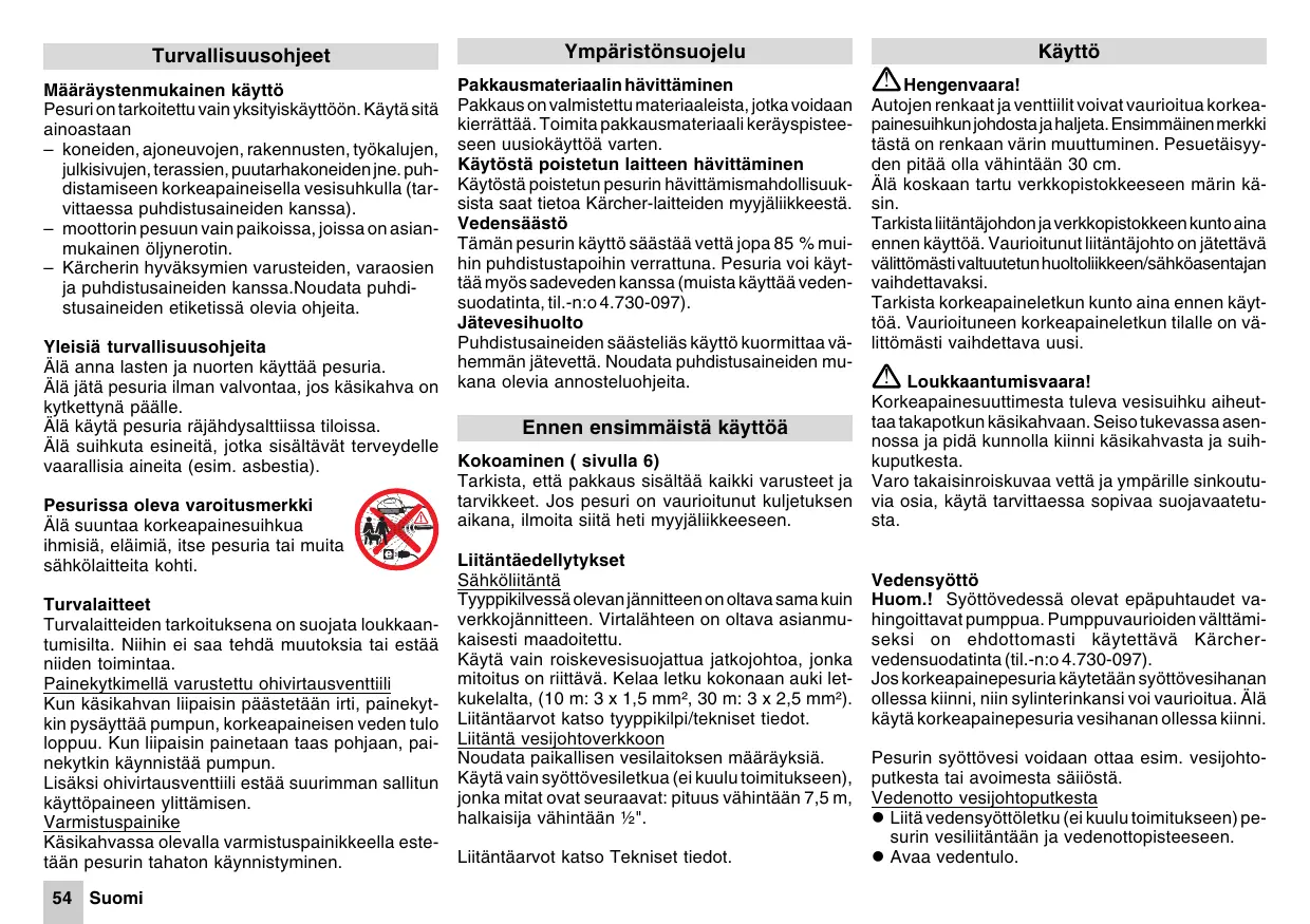 Turvallisuusohjeet Määräystenmukainen käyttö Pesuri on tarkoitettu vain yksityiskäyttöön. Käytä sitä ainoastaan – koneiden, ajoneuvojen, rakennusten, työkalujen, julkisivujen, terassien, puutarhakoneiden jne. puhdistamiseen korkeapaineisella vesisuhkulla (tarvittaessa puhdistusaineiden kanssa). – moottorin pesuun vain paikoissa, joissa on asianmukainen öljynerotin. – Kärcherin hyväksymien varusteiden, varaosien ja puhdistusaineiden kanssa.Noudata puhdistusaineiden etiketissä olevia ohjeita. Yleisiä turvallisuusohjeita Älä anna lasten ja nuorten käyttää pesuria. Älä jätä pesuria ilman valvontaa, jos käsikahva on kytkettynä päälle. Älä käytä pesuria räjähdysalttiissa tiloissa. Älä suihkuta esineitä, jotka sisältävät terveydelle vaarallisia aineita (esim. asbestia). Pesurissa oleva varoitusmerkki Älä suuntaa korkeapainesuihkua ihmisiä, eläimiä, itse pesuria tai muita sähkölaitteita kohti. Turvalaitteet Turvalaitteiden tarkoituksena on suojata loukkaantumisilta. Niihin ei saa tehdä muutoksia tai estää niiden toimintaa. Painekytkimellä varustettu ohivirtausventtiili Kun käsikahvan liipaisin päästetään irti, painekytkin pysäyttää pumpun, korkeapaineisen veden tulo loppuu. Kun liipaisin painetaan taas pohjaan, painekytkin käynnistää pumpun. Lisäksi ohivirtausventtiili estää suurimman sallitun käyttöpaineen ylittämisen. Varmistuspainike Käsikahvassa olevalla varmistuspainikkeella estetään pesurin tahaton käynnistyminen. 54 Suomi Ympäristönsuojelu Pakkausmateriaalin hävittäminen Pakkaus on valmistettu materiaaleista, jotka voidaan kierrättää. Toimita pakkausmateriaali keräyspisteeseen uusiokäyttöä varten. Käytöstä poistetun laitteen hävittäminen Käytöstä poistetun pesurin hävittämismahdollisuuksista saat tietoa Kärcher-laitteiden myyjäliikkeestä. Vedensäästö Tämän pesurin käyttö säästää vettä jopa 85 % muihin puhdistustapoihin verrattuna. Pesuria voi käyttää myös sadeveden kanssa (muista käyttää vedensuodatinta, til.-n:o 4.730-097). Jätevesihuolto Puhdistusaineiden säästeliäs käyttö kuormittaa vähemmän jätevettä. Noudata puhdistusaineiden mukana olevia annosteluohjeita. Ennen ensimmäistä käyttöä Kokoaminen ( sivulla 6) Tarkista, että pakkaus sisältää kaikki varusteet ja tarvikkeet. Jos pesuri on vaurioitunut kuljetuksen aikana, ilmoita siitä heti myyjäliikkeeseen. Liitäntäedellytykset Sähköliitäntä Tyyppikilvessä olevan jännitteen on oltava sama kuin verkkojännitteen. Virtalähteen on oltava asianmukaisesti maadoitettu. Käytä vain roiskevesisuojattua jatkojohtoa, jonka mitoitus on riittävä. Kelaa letku kokonaan auki letkukelalta, (10 m: 3 x 1,5 mm², 30 m: 3 x 2,5 mm²). Liitäntäarvot katso tyyppikilpi/tekniset tiedot. Liitäntä vesijohtoverkkoon Noudata paikallisen vesilaitoksen määräyksiä. Käytä vain syöttövesiletkua (ei kuulu toimitukseen), jonka mitat ovat seuraavat: pituus vähintään 7,5 m, halkaisija vähintään ½". Liitäntäarvot katso Tekniset tiedot. Käyttö