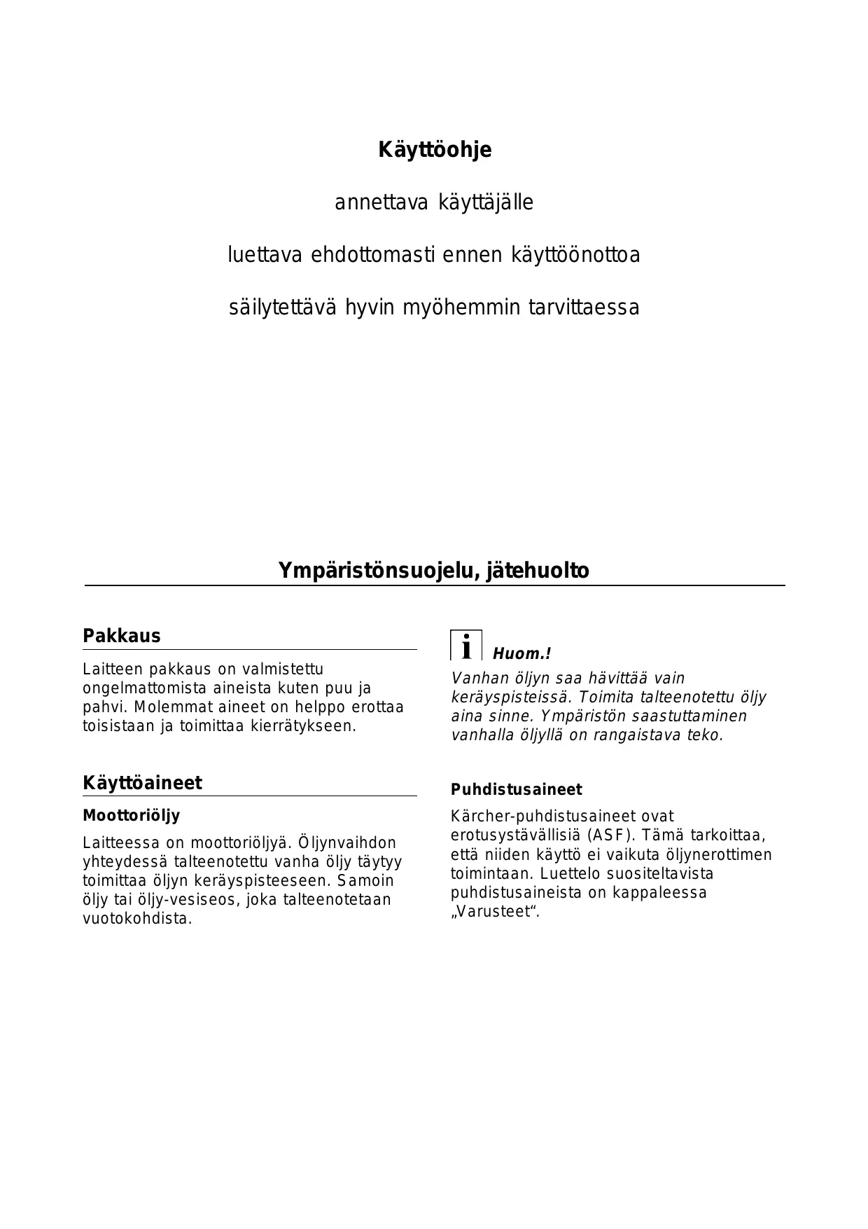 Käyttoohje annettava käyttäjälle luettava ehdottomasti ennen käyttüünottoa säilytettävä hyvin myôhemmin tarvittaessa Ympäristônsuojelu, jätehuolto Pakkaus Laitteen pakkaus on valmistettu ongelmattomista aineista Kuten puu ja pahvi. Molemmat aineet on helppo erottaa toisistaan ja toimittaa kierrätykseen. Käyttoaineet Moottoriôljy Laitteessa on moottoriôljyàä. Üljynvaihdon yhteydessä talteenotettu vanha ôljy täytyy toimittaa ôljyn keräyspisteeseen. Samoin ôljy tai ljy-vesiseos, joka talteenotetaan vuotokohdista. fi] Huom.! Vanhan ôljyn saa hävittää vain keräyspisteissä. Toimita talteenotettu üljy aina sinne. Ympäristôn saastuttaminen vanhalla Gljyllä on rangaistava teko. Puhdistusaineet Kärcher-puhdistusaineet ovat erotusystävällisià (ASF). Tämä tarkoittaa, ettà niiden käyttô ei vaikuta ôljynerottimen toimintaan. Luettelo suositeltavista puhdistusaineista on kappaleessa ANVarusteet".
