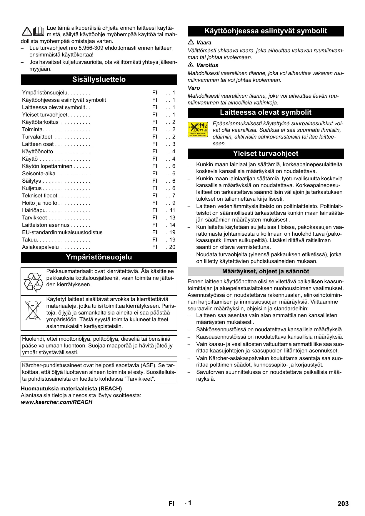 SV - 20 Lue tämä alkuperäisiä ohjeita ennen laitteesi käyttämistä, säilytä käyttöohje myöhempää käyttöä tai mahdollista myöhempää omistajaa varten. – Lue turvaohjeet nro 5.956-309 ehdottomasti ennen laitteen ensimmäistä käyttökertaa! – Jos havaitset kuljetusvaurioita, ota välittömästi yhteys jälleenmyyjään. Sisällysluettelo Ympäristönsuojelu. . . . . . . . Käyttöohjeessa esiintyvät symbolit Laitteessa olevat symbolit . . Yleiset turvaohjeet. . . . . . . . Käyttötarkoitus . . . . . . . . . . Toiminta. . . . . . . . . . . . . . . . Turvalaitteet . . . . . . . . . . . . Laitteen osat . . . . . . . . . . . . Käyttöönotto . . . . . . . . . . . . Käyttö . . . . . . . . . . . . . . . . . Käytön lopettaminen . . . . . . Seisonta-aika . . . . . . . . . . . Säilytys . . . . . . . . . . . . . . . . Kuljetus . . . . . . . . . . . . . . . . Tekniset tiedot . . . . . . . . . . . Hoito ja huolto . . . . . . . . . . . Häiriöapu. . . . . . . . . . . . . . . Tarvikkeet . . . . . . . . . . . . . . Laitteiston asennus . . . . . . . EU-standardinmukaisuustodistus Takuu. . . . . . . . . . . . . . . . . . Asiakaspalvelu . . . . . . . . . .