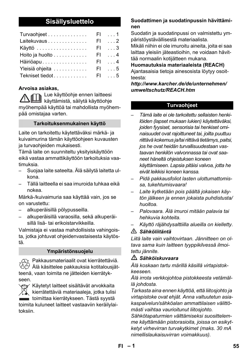 Le filtre et le sac du filtre sont fabriqués en matériaux recyclables. S'ils ne contiennent aucune substance aspirée dont l'élimination est interdite dans les déchets ménagers, vous pouvez les jeter dans les déchets ordinaires. Instructions relatives aux ingrédients (REACH) Les informations actuelles relatives aux ingrédients se trouvent sous : http://www.karcher.de/de/unternehmen/ umweltschutz/REACH.htm