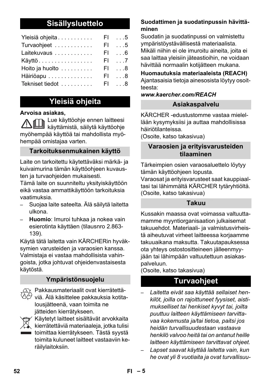 Yleisiä ohjeita . . . . . . . . . . . Turvaohjeet . . . . . . . . . . . . Laitekuvaus . . . . . . . . . . . . Käyttö . . . . . . . . . . . . . . . . . Hoito ja huolto . . . . . . . . . . Häiriöapu . . . . . . . . . . . . . . Tekniset tiedot . . . . . . . . . .
