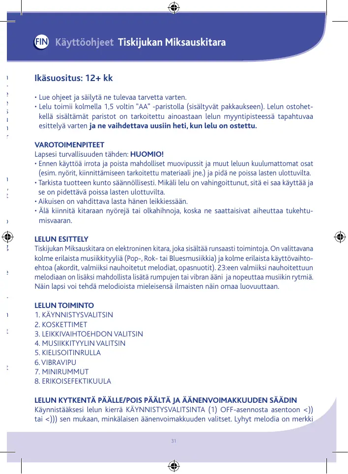 élimination compatible avec l’environnement aide à prévenir d’éventuels effets négatifs sur l’environnement et la santé et favorise le recyclage des matériaux contenus dans les piles. L’élimination abusive du produit par l’utilisateur provoque des dommages à l’environnement et compromet la santé. Pour plus d’informations sur les systèmes de ramassage disponibles, adressez-vous au service local en charge du ramassage des ordures ou au magasin où a été acheté le produit. MISE EN PLACE ET/OU REMPLACEMENT DES PILES • Le remplacement des piles doit toujours être fait par un adulte. • Pour remplacer les piles : desserrer la vis du couvercle sous la guitare à l’aide d’un tournevis, ôter le couvercle et enlever les piles usagées. Introduire les piles neuves en veillant à respecter la polarité (comme indiquée sur le produit), remettre le couvercle en place et revisser à fond. • Ne pas laisser les piles ou des outils éventuels à portée des enfants. • Toujours enlever les piles usagées pour éviter que d’éventuelles fuites de liquide n’endommagent le produit. • Toujours enlever les piles si le jouet n’est pas utilisé pendant une longue période. • Utiliser des piles alcalines identiques ou équivalentes au type de piles recommandé pour le fonctionnement de ce produit. • Ne pas mélanger différents types de piles ou des piles usagées avec des piles neuves. • Ne pas jeter les piles usagées dans le feu et ne pas les jeter dans la nature. Les mettre dans les conteneurs de recyclage prévus à cet effet. • Ne pas provoquer de court-circuit avec les bornes d’alimentation. • Ne pas tenter de recharger les piles non rechargeables : elles pourraient exploser. • L’utilisation de piles rechargeables est déconseillée car elles pourraient réduire le fonctionnement du jouet. • En cas d’utilisation de piles rechargeables, les extraire du jouet avant de les recharger et procéder à la recharge uniquement sous la surveillance d’un adulte. NETTOYAGE ET ENTRETIEN DU JOUET • Nettoyer le jouet avec un chiffon doux et sec pour ne pas endommager le circuit électronique. • Ne pas plonger le jouet dans l’eau. • Protéger avec soin le jouet de la chaleur, de la poussière, du sable et de l’eau. • Le produit ne doit pas être réparé ou modifié par l’acheteur ou par du personnel non qualifié.