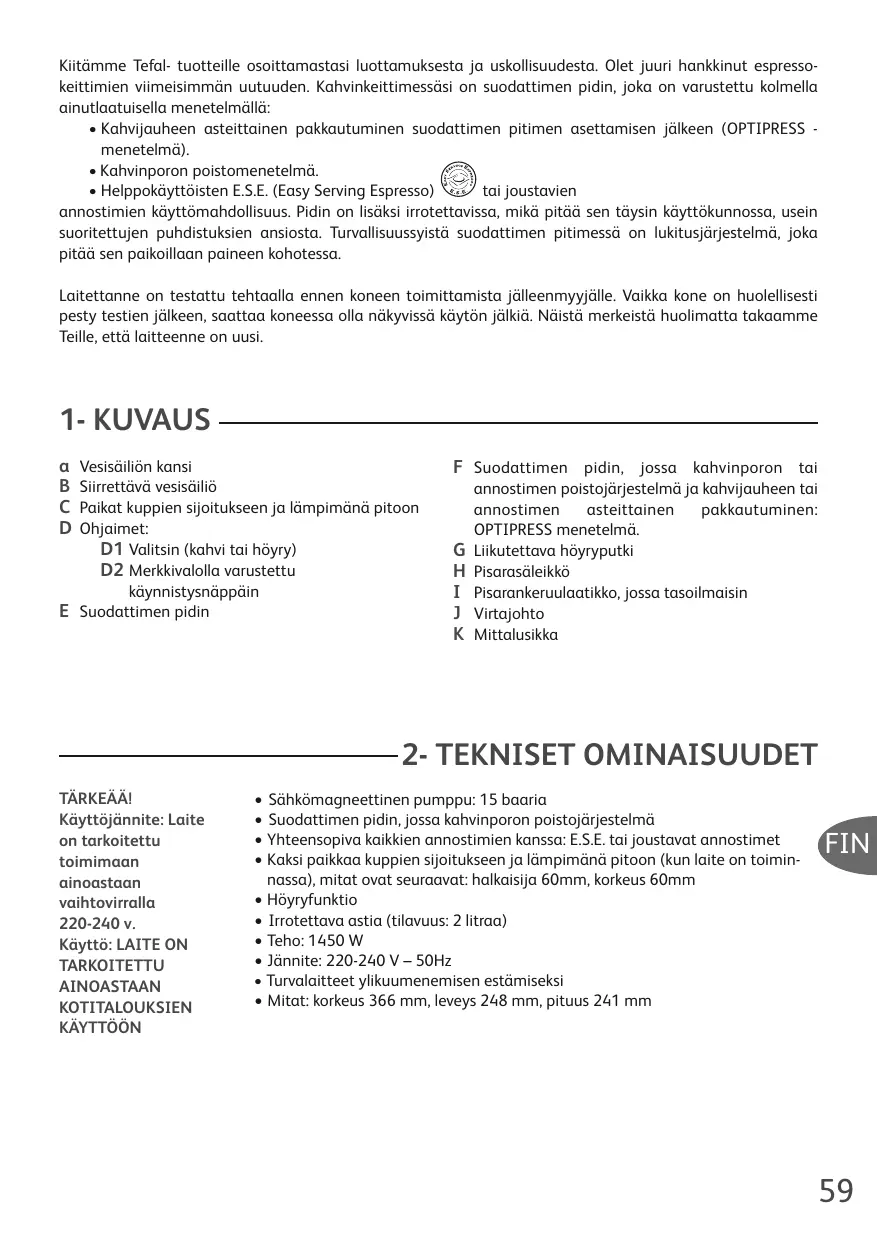 Kiitämme Tefal- tuotteille osoittamastasi luottamuksesta ja uskollisuudesta. Olet juuri hankinut espressokeittimien viemeisimmän uuteuuden. Kahvinkeittmessä on suodattimen pidin, joka on varustetty kolmella ainutlaatuisella menetelmällä:
