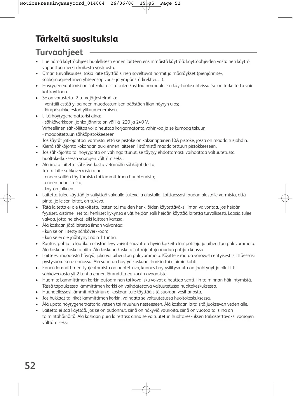 NoticePressingEasycord_ 014004 26/06/06 & Page 55 Täytä lämmitin käytôn aikana koskaan kierrä + HYVIN TARKEAÂ: Ennen lämmittimen avaamista on varmistuttava, että hôyryä lämmittimen korkkia auki ei enää ole jäjellë. Paina tätà varten raudan hôyryvalitsinta (C), kunnes hôyryä niin kauan kuin raudasta ei enää ole. tulee hôyryä. + Pysäytä hôyrygeneraattori painamalle Käyntivalitsinta ja irrottamalla pistoke sähkôverkosta + Kierrä lämmittimen korkki hitaasti auki + Käytä vesikarahvia ja täyt se enintään litralla vettä + Tüytä lômmitin, varo, että vesi ei vuoda y. Jos vettä vuotaa yl, poista ylimääräi- nen vesi + Kierrä lämmittimen korkki pohjaan, kiinnitä hôyrygeneraattori sähkëverkkoon ja Käynnistä late. + Odota kunnes lämmitin kuumenee. Noin 8 minuutin kulutta tai kun hôyryn merkkivalo syttyy (mallsta riippuen), hôyry on valmista. Laita hôyrygeneraattori säilytykseen Sammuta Käyntivalitsin ja irrota pistoke sähkôverkosta. là koskaan laita rautaa + Kierrä sähkôjohto (E). metallista valmistetulle + Laïta rauta hôyrygeneraattorin alustan levylle alustalle, se voi pilata + Kiilaa teleskooppijohto aukkoon (mallsta riippuen). Ota johdon ulostulopäästä … raudan, laita rauta Kiinni ja paina saadaksesi joustavan pään alustan (F) sisään. laatikon alustalle: se on +__Laita hôyryjohto (G) säilytyspaikkaansa. varustettu + Anna hôyrygenerattorin jäähtyä, ennen kuin laitat sen säilytykseen tai pieneen luistamattomalla tilaan. pohjalla, joka on + Voit laittaa hôyrygeneraattorisi säilytyksen turvallisesti suunniteltu kestämään korkeita lämpôtiloja. Hoito ja puhdistus Aina ennen hoitoa on varmistettava että rauta on irrotettu sähkôverkosta ja että pohja ja raudan alustan levy ovat jäähtyneet. Àlä käytä hoitoaineita tai kalkinpoistoaineita puhdistaaksesi pohjaa tai laatikkoa: Âlà koskaan laita rautaa tai sen laatikkoa juoksevan veden alle. Puhdista pohja + Puhdista pohja säännôllsesti, Käytä sientä, ei kuitenkaan metallista Puhdista laatikko . Phaser rues silloin tällôin pehmeällä kevyesti kostutetulla kankaalla. Huuhtele lämmitin ÉDtterran kuussa) + Huomio: Varmistaaksesi lämmittimen tehokkaan toiminnan pidempään ja Jos vetesi on kovaa, tee välttääksesi kalkin valumisen sinun on ehdottomasti huuhdeltava lämmitin 10 operaatio useammin. Käytôn välein (H) (noin kerran kuukaudessa) Âlà missään tapauksessa + Varmista, että hôyrygeneraattori on jäähtynyt ja irrotettu sähkôverkosta ainakin_käytä kalkinpoistoaineita 2 tuntia aiemmin huuhdellessasi + Tütä lémmitin karahvista kaatamallasi vesijohtovedellä noin 3/4 saakka: lämmitintä: se voi + Likuta laatikkoa jonkin aikaa, tyhjennä se sitten vesialtaan päällà (1) vahingoittua. + Jotta saat hyvän tuloksen, kehotamme sinua toistamaan operaation toiseen kertaan. —à&—