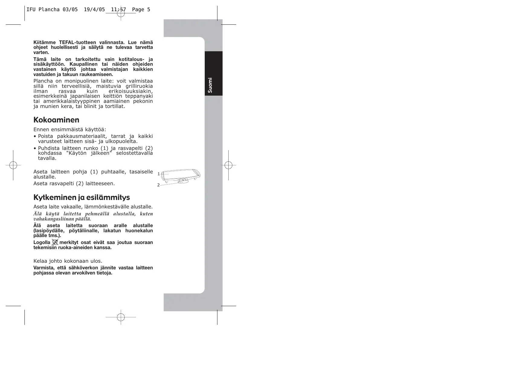 Téléchargez la notice de votre Keittiökone au format PDF gratuitement ! Retrouvez votre notice PLANCHA - TEFAL et reprennez votre appareil électronique en main. Sur cette page sont publiés tous les documents nécessaires à l'utilisation de votre appareil PLANCHA de la marque TEFAL.