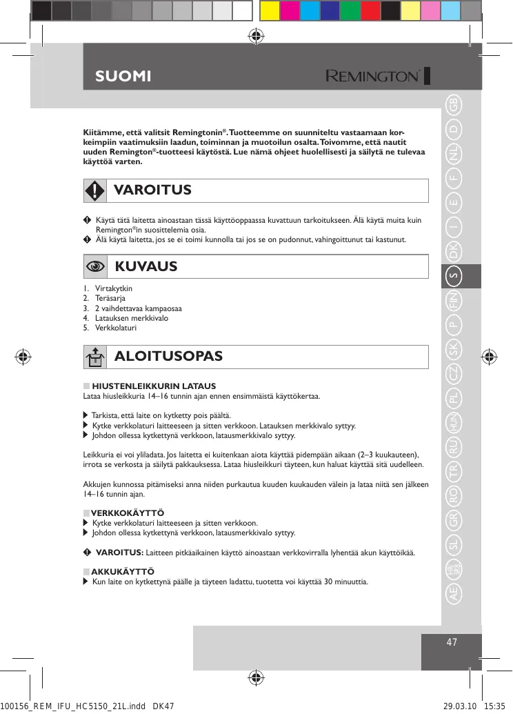 PALOVAMMOJEN, SÄHKÖISKUJEN,TULIPALOJEN JA HENKILÖVAHINKOJEN VÄLTTÄMISEKSI: Älä jätä laitetta ilman valvontaa sen ollessa kytkettynä virtalähteeseen. Pidä pistoke ja virtajohto poissa kuumien pintojen läheisyydestä. Huolehdi siitä, että pistoke ja virtajohto eivät pääse kastumaan. Älä kytke laitetta verkkoon tai irrota sitä verkosta märin käsin. Älä käytä laitetta, jos sen virtajohto on vahingoittunut.Vaihto-osan voit hankkia lähimmästä Remington®-huoltoliikkeestä. Lataa, käytä ja säilytä laitetta 15°C – 35°C lämpötilassa. Irrota laite aina verkosta puhdistuksen ajaksi. Käytä ainoastaan laitteen mukana toimitettuja osia. Tätä rajainta ei voi pestä. Laitteen tippuessa vahingossa veteen varmista ennen siihen koskemista, ettei se saa virtaa pistorasiasta. Pidä laite poissa lasten ulottuvilta. Helposti haavoittuvien ihmisten on noudatettava erityistä huolellisuutta, ja he voivat tarvita apua tuotteen käytössä.