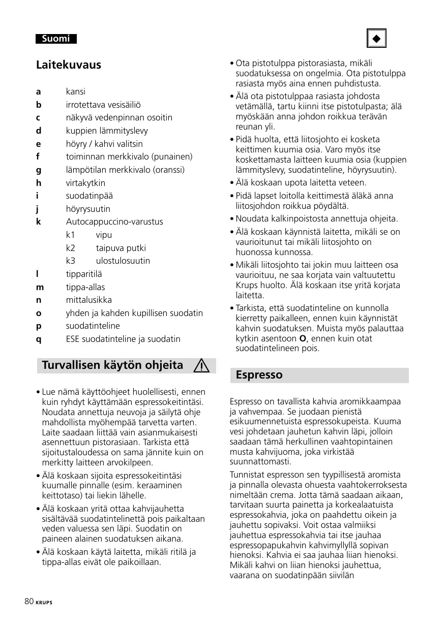 - Mikäli liitosjohto tai jokin muu laitteen osa vaurioituu, ne saa korjata vain valtuutettu Krups huolto. Älä koskaan itse yritä korjata laitetta.