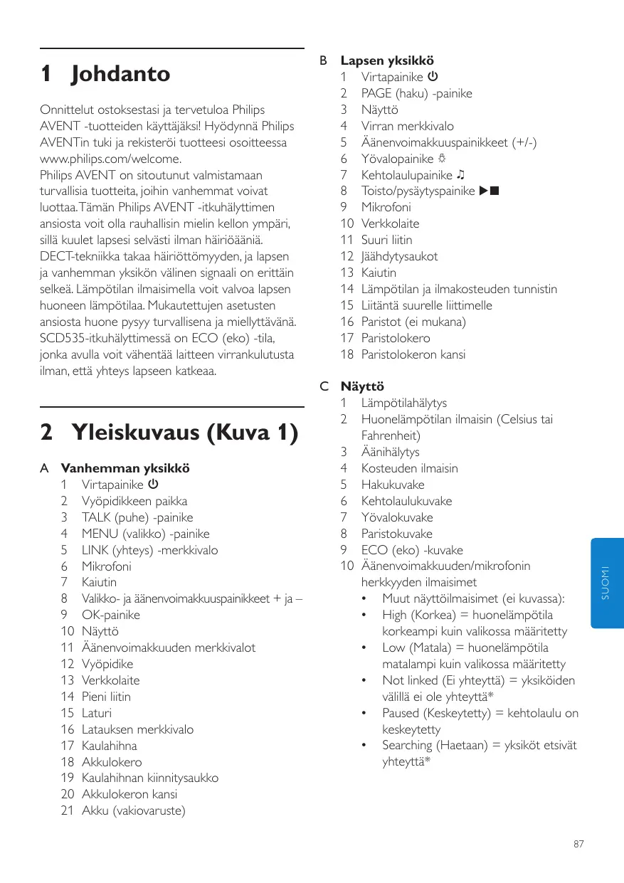 - Es posible que el símbolo de la pila tarde varios minutos en aparecer en la pantalla de la unidad de padres cuando la cargue por primera vez o tras un largo periodo sin usarla. Onnittelut ostoksestasi ja tervetuloa Philips AVENT -tuotteiden käyttäjäksi! Hyödynnä Philips AVENTin tuki ja rekisteröi tuotteesi osoitteessa www.philips.com/welcome. Philips AVENT on sitoutunut valmistamaan turvallisia tuotteita, joihin vanhemmat voivat luottaa. Tämän Philips AVENT -itkuhälyttimen ansiosta voit olla rauhallisin mielin kellon ympäri, sillä kuulet lapsesi selvästi ilman häiriöääniä. DECT-tekniikka takaa häiriöttömyyden, ja lapsen ja vanhemman yksikön välinen signaali on erittäin selkeä. Lämpötilan ilmaisimella voit valvoa lapsen huoneen lämpötilaa. Mukautettujen asetusten ansiosta huone pysyy turvallisena ja miellyttävänä. SCD535-itkuhälyttimessä on ECO (eko) -tila, jonka avulla voit vähentää laitteen virrankulutusta ilman, että yhteys lapseen katkeaa. 2 Yleiskuvaus (Kuva 1) A Vanhemman yksikkö 1 Virtapainike 3 2 Vyöpidikkeen paikka 3 TALK (puhe) -painike 4 MENU (valikko) -painike 5 LINK (yhteys) -merkkivalo 6 Mikrofoni 7 Kaiutin 8 Valikko- ja äänenvoimakkuuspainikkeet + ja – 9 OK-painike 10 Näyttö 11 Äänenvoimakkuuden merkkivalot 12 Vyöpidike 13 Verkkolaite 14 Pieni liitin 15 Laturi 16 Latauksen merkkivalo 17 Kaulahihna 18 Akkulokero 19 Kaulahihnan kiinnitysaukko 20 Akkulokeron kansi 21 Akku (vakiovaruste)