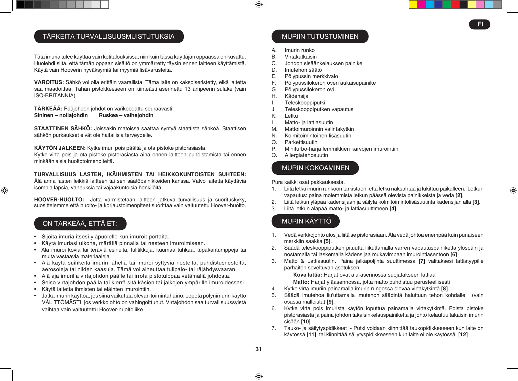Tätä imuria tulee käyttää vain kotitalouksissa, niin kuin tässä käyttäjän oppaassa on kuvattu. Huolehdi siitä, että tämän oppaan sisältö on ymmärretty täysin ennen laitteen käyttämistä. Käytä vain Hooverin hyväksymiä tai myymiä lisävarusteita. Varoitus: Sähkö voi olla erittäin vaarallista. Tämä laite on kaksoiseristetty, eikä laitetta saa maadoittaa. Tähän pistokkeeseen on kiinteästi asennettu 13 ampeerin sulake (vain ISO-BRITANNIA). Tärkeää: Pääjohdon johdot on värikoodattu seuraavasti: Sininen – nollajohdin Ruskea – vaihejohdin STAATTINEN SÄHKÖ: Joissakin matoissa saattaa syntyä staattista sähköä. Staattisen sähkön purkaukset eivät ole haitallisia terveydelle. KÄYTÖN JÄLKEEN: Kytke imuri pois päältä ja ota pistoke pistorasiasta. Kytke virta pois ja ota pistoke pistorasiasta aina ennen laitteen puhdistamista tai ennen minkäänlaisia huoltotoimenpiteitä. Imurin runko Virtakatkaisin Johdon sisäänkelauksen painike Imutehon säätö Pölypussin merkkivalo Pölypussilokeron oven aukaisupainike Pölypussilokeron ovi Kädensija Teleskooppiputki Teleskooppiputken vapautus Letku Matto- ja lattiasuutin Mattoimuroinnin valintakytkin Kolmitoimintoinen lisäsuutin Parkettisuutin Miniturbo-harja lemmikkien karvojen imurointiin Allergiatehosuutin Imurin kokoaminen Turvallisuus lasten, ikäihmisten tai heikkokuntoisten suhteen: Älä anna lasten leikkiä laitteen tai sen säätöpainikkeiden kanssa. Valvo laitetta käyttäviä isompia lapsia, vanhuksia tai vajaakuntoisia henkilöitä. Pura kaikki osat pakkauksesta.