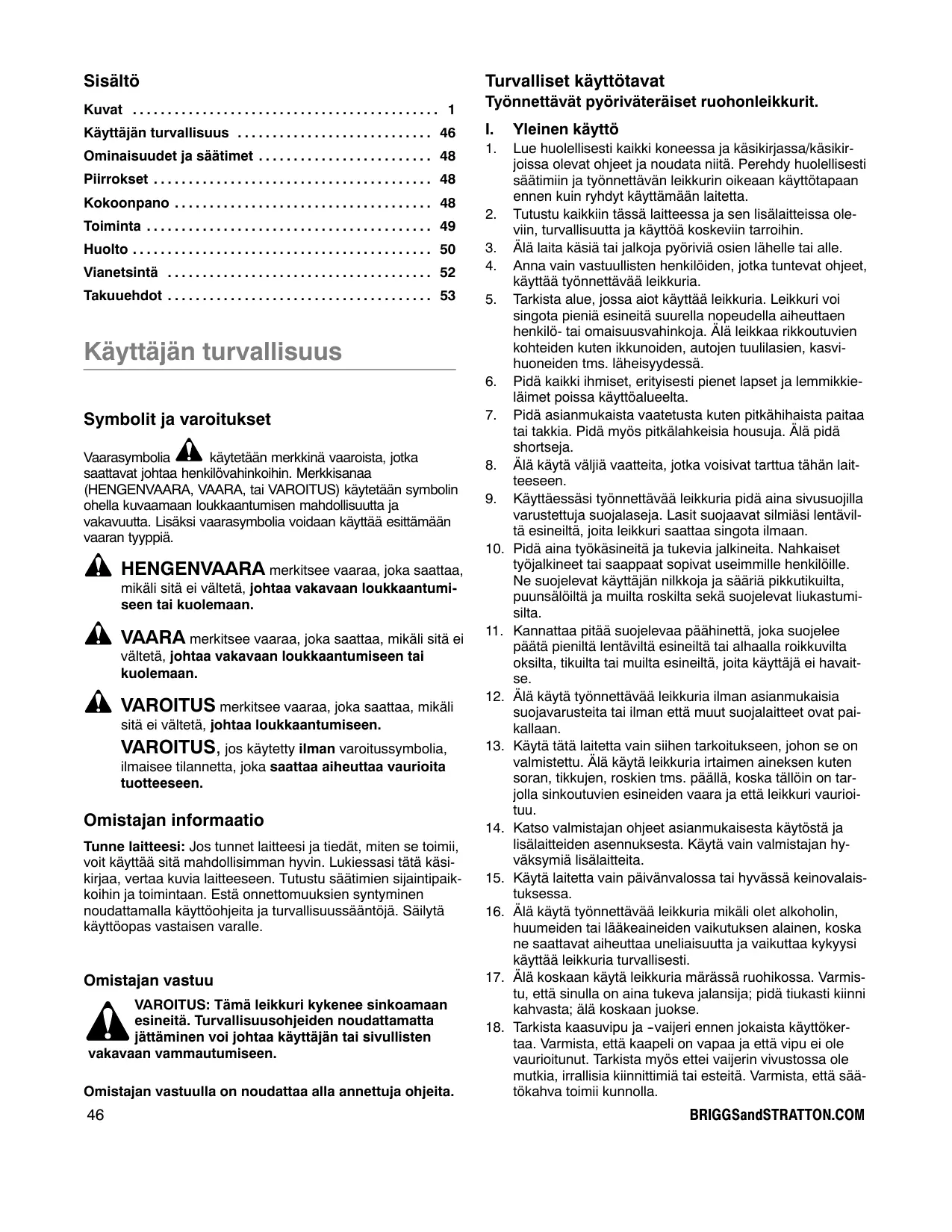 Cette garantie ne couvre que les défauts de matière ou de construction liés au produit. Afin d’éviter tout malentendu entre le client et le Réparateur Agréé, sont énumérées ci-après certaines des causes de défaillance des produits qui ne sont pas couvertes par la garantie. • Usure normale: les appareils équipés de petits moteurs, comme tous les appareils mécaniques, nécessitent un entretien régulier et le remplacement des pièces d’usure pour fonctionner correctement. Cette garantie ne couvre pas la réparation de pièces ou de produits dont l’usure provient d’un usage normal. • Installation: cette garantie ne s’applique pas à un produit ayant fait l’objet d’une installation, altération ou modification inappropriée ou interdite ni aux installations qui empêchent le démarrage et entraînent de mauvaises performances du moteur. • Entretien inadéquat: la durée de vie de ce produit dépend des conditions dans lesquelles il est utilisé et de l’entretien qu’il reçoit. Les intervalles d’entretien et de réglage recommandés sont indiqués dans le manuel d’utilisation. Les produits tels que motoculteurs, dressebordures ou tondeuses rotatives, sont utilisés dans un environnement poussiéreux ou sale, pouvant être la cause d’une usure qui peut sembler prématurée. Une telle usure, lorsqu’elle est consécutive à l’entrée de poussière, sable ou autre produit abrasif en raison d’un mauvais entretien, n’est pas couverte par la garantie. De même, la garantie ne couvre pas les réparations dues à des problèmes découlant du remplacement de pièces par des pièces non d’origine. • Insuffisance ou erreur de carburant ou de lubrifiant: cette garantie ne couvre pas les dommages provoqués par l’utilisation de carburants éventés ou d’essences modifiées. Les dommages subis par le moteur ou ses composants, à savoir chambre de combustion, soupapes, sièges de soupape, guides de soupape ou bobinage du démarreur grillé, suite à l’emploi de carburants de substitution tels que pétrole liquéfié ou gaz naturel, ne sont pas couverts à moins que le moteur ne soit certifié pour cet usage. Les pièces qui seraient rayées ou cassées du fait d’un manque d’huile ou d’une huile polluée ou dont le degré de viscosité est inadéquat, ainsi que les composants endommagés en raison d’un manque de lubrification ne sont pas couverts. • Utilisation inadéquate: le fonctionnement approprié du produit est stipulé dans le manuel d’utilisation. Ne sont pas couverts les cas suivants. Produit endommagé suite à un sur-régime, une surchauffe ou une utilisation dans un espace confiné où la ventilation est insuffisante. Bris du produit dû à des vibrations excessives résultant d’un serrage insuffisant des boulons de fixation du moteur, d’une lame ou turbine desserrée ou mal équilibrée, d’un sur-régime ou d’un vilebrequin faussé suite à un choc sur un corps dur. Dommages ou dysfonctionnements résultant d’accidents, utilisation abusive, mauvais entretien, gel, détérioration chimique ainsi qu’usage en dehors des capacités recommandées stipulées dans le manuel d’utilisation. • Mise au point normale, éléments d’usure ou réglages: cette garantie exclut les éléments d’usure tels que notamment huile, courroies, lames, joints toriques, filtres. Les interventions sous garantie ne sont effectuées que par les Réparateurs Agréés. Recherchez-les dans la liste des Réparateurs sur notre site Internet BRIGGSandSTRATTON.COM