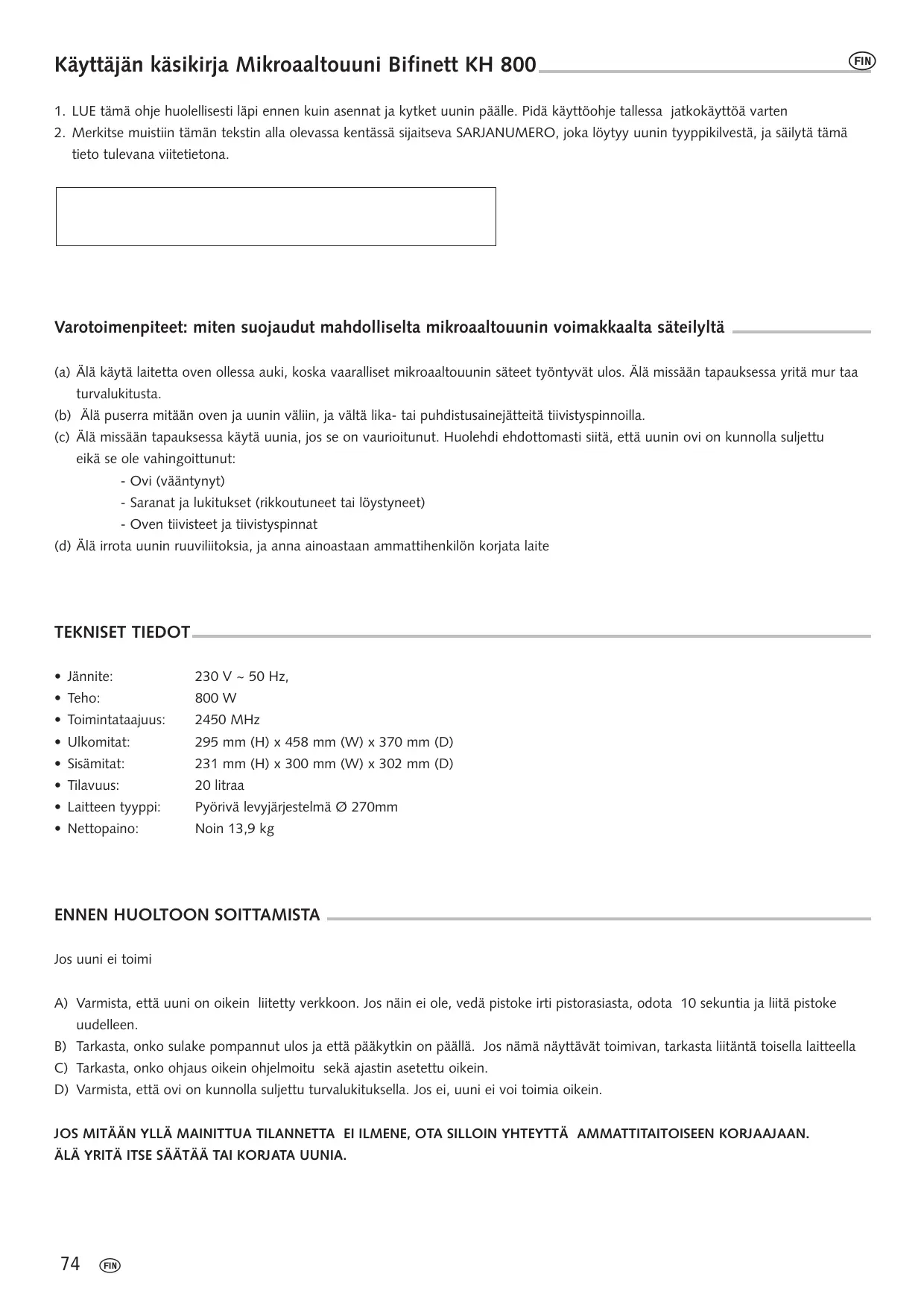 KÄYTTÖOHJE KH 800 BIFINETT