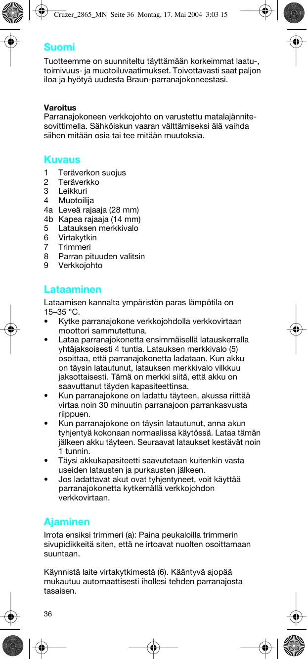 Téléchargez la notice de votre Hiustenleikkuri au format PDF gratuitement ! Retrouvez votre notice CRUZER3 2878 - BRAUN et reprennez votre appareil électronique en main. Sur cette page sont publiés tous les documents nécessaires à l'utilisation de votre appareil CRUZER3 2878 de la marque BRAUN.