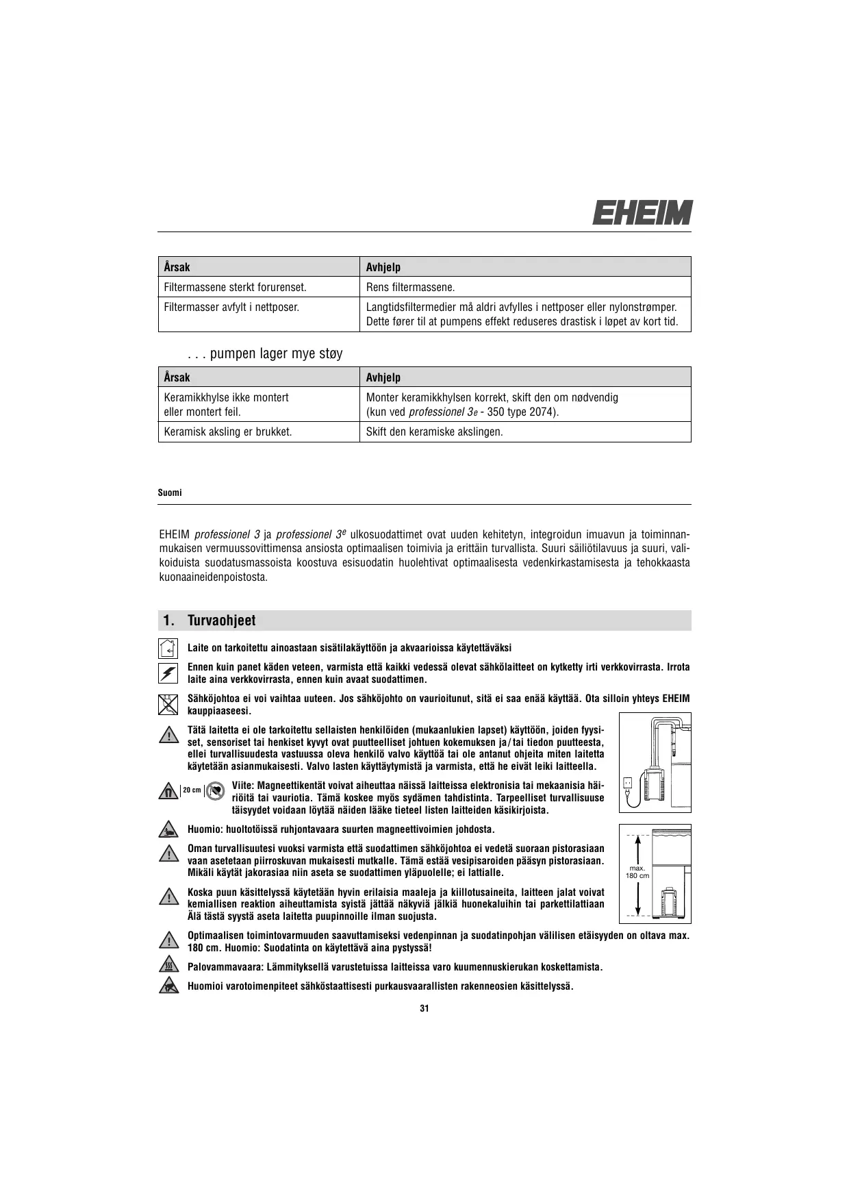Laite on tarkoitettu ainoastaan sisätilakäyttöön ja akvaarioissa käytettäväksi Ennen kuin panet käden veteen, varmista että kaikki vedessä olevat sähkölaitteet on kytketty irti verkkovirrasta. Irrota laite aina verkkovirrasta, ennen kuin avaat suodattimen. Sähköjohtoa ei voi vaihtaa uuteen. Jos sähköjohto on vaurioitunut, sitä ei saa enää käyttää. Ota silloin yhteys EHEIM kauppiaaseesi. Tätä laitetta ei ole tarkoitettu sellaisten henkilöiden (mukaanlukien lapset) käyttöön, joiden fyysiset, sensoriset tai henkiset kyvyt ovat puutteelliset johtuen kokemuksen ja / tai tiedon puutteesta, ellei turvallisuudesta vastuussa oleva henkilö valvo käyttöä tai ole antanut ohjeita miten laitetta käytetään asianmukaisesti. Valvo lasten käyttäytymistä ja varmista, että he eivät leiki laitteella. 20 cm Viite: Magneettikentät voivat aiheuttaa näissä laitteissa elektronisia tai mekaanisia häiriöitä tai vauriotia. Tämä koskee myös sydämen tahdistinta. Tarpeelliset turvallisuuse täisyydet voidaan löytää näiden lääke tieteel listen laitteiden käsikirjoista. Huomio: huoltotöissä ruhjontavaara suurten magneettivoimien johdosta. Oman turvallisuutesi vuoksi varmista että suodattimen sähköjohtoa ei vedetä suoraan pistorasiaan vaan asetetaan piirroskuvan mukaisesti mutkalle. Tämä estää vesipisaroiden pääsyn pistorasiaan. Mikäli käytät jakorasiaa niin aseta se suodattimen yläpuolelle; ei lattialle. max. 180 cm Koska puun käsittelyssä käytetään hyvin erilaisia maaleja ja kiillotusaineita, laitteen jalat voivat kemiallisen reaktion aiheuttamista syistä jättää näkyviä jälkiä huonekaluihin tai parkettilattiaan Älä tästä syystä aseta laitetta puupinnoille ilman suojusta. Optimaalisen toimintovarmuuden saavuttamiseksi vedenpinnan ja suodatinpohjan välilisen etäisyyden on oltava max. 180 cm. Huomio: Suodatinta on käytettävä aina pystyssä! Palovammavaara: Lämmityksellä varustetuissa laitteissa varo kuumennuskierukan koskettamista. Huomioi varotoimenpiteet sähköstaattisesti purkausvaarallisten rakenneosien käsittelyssä.
