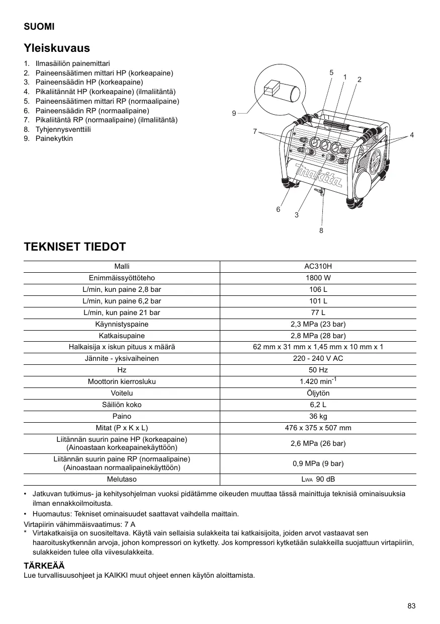 SUOMI Yleiskuvaus Ilmasäiliôn painemittari Paineensäätimen mittari HP (korkeapaine) Paineensäädin HP (korkeapaine) Pikaliitännät HP (korkeapaine) (ilmalitäntä) Paineensäätimen mittari RP (normaalipaine) Paineensäädin RP (normaalipaine) Pikalitäntä RP (normaalipaine) (mali Tyhjennysventtli Painekytkin ntä) pLoNpnswn TEKNISET TIEDOT Mali AC310H Enimmäissyôttôteho 1800 W Limin, kun paine 2,8 bar 106 L Limin, kun paine 6,2 bar
