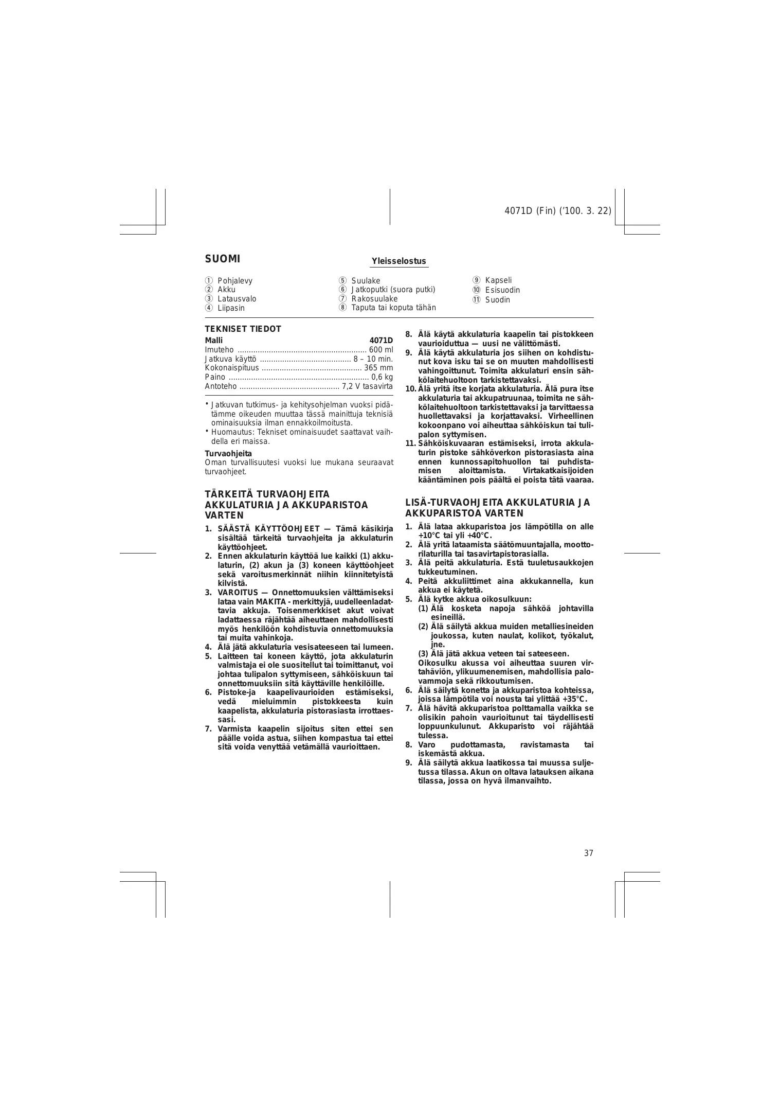 TEKNISET TIEDOT Malli 4071D Imuteho 600 ml Jatkuva käyttö 8 – 10 min. Kokonaispituus 365 mm Paino 0,6 kg Antoteho 7,2 V tasavirta • Jatkuvan tutkimus- ja kehitysohjelman vuoksi pidätämme oikeuden muuttaa tässä mainittuja teknisiä ominaisuuksia ilman ennakkoilmoitusta. • Huomautus: Tekniset ominaisuudet saattavat vaihdella eri maissa. Turvaohjeita Oman turvallisuutesi vuoksi lue mukana seuraavat turvaohjeet.