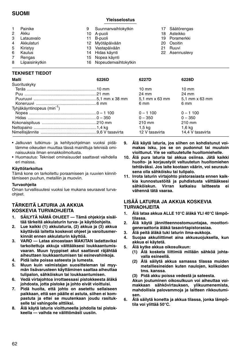 SUOMI Yleisselostus 1 Painike 9 Suunnanvaihtokytkin 17. Säätôrengas 2 Akku 10 A-puoli 18. Asteikko 3 Latausvalo 11 B-puoli 19. Poramerkki 4 Akkulaturi 12 Myôtäpäivään 20 Osoitin 5 Kiristyy 13. Vastapäivään 21 Ruuvi 6 Kaulus 14. Hidas käynti 22 Asennuslevy 7 Rengas 15. Nopea käynti 8 Lipaisinkytkin 16. Nopeudenvaihtokytkin TEKNISET TIEDOT Malli 6226D 6227D 6228D Suorituskyky Teräs 10 mm 10 mm Puu … 24 mm 24 mm Puuruuvi 51mmx63mm 5,1mmx63 mm Koneruuvi . 6mm 6 mm Tyhjäkäyntinopeus (in Nopea . 0-1100 0-1100 Hidas . 0- 350 0- 350 Kokonaispituus 210 mm 210 mm Nettopaino 1,5kg 1,6kg