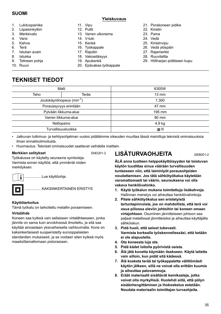 - Huomautus: Tekniset ominaisuudet saattavat vaihdella maittain. Merkkien selitykset Työkalussa on käytetty seuraavia symboleja. Varmista ennen käyttöä, että ymmärrät niiden merkityksen. END201-2 ................ Lue käyttöohje. ................ KAKSINKERTAINEN ERISTYS Käyttötarkoitus Tämä työkalu on tarkoitettu metallin poraamiseen. Virtalähde Koneen saa kytkeä vain sellaiseen virtalähteeseen, jonka jännite on sama kuin arvokilvessä ilmoitettu, ja sitä saa käyttää ainoastaan yksivaiheisella vaihtovirralla. Kone on kaksinkertaisesti suojaeristetty eurooppalaisten standardien mukaisesti, ja se voidaan siten kytkeä myös maadoittamattomaan pistorasiaan. LISÄTURVAOHJEITA GEB001-2 ÄLÄ anna tuotteen helppokäyttöisyyden tai toistuvan käytön tuudittaa sinua väärään turvallisuuden tunteeseen niin, että laiminlyöt porausohjeiden noudattamisen. Jos tätä sähkötyökalua käytetään varomattomasti tai väärin, seurauksena voi olla vakava henkilövahinko.