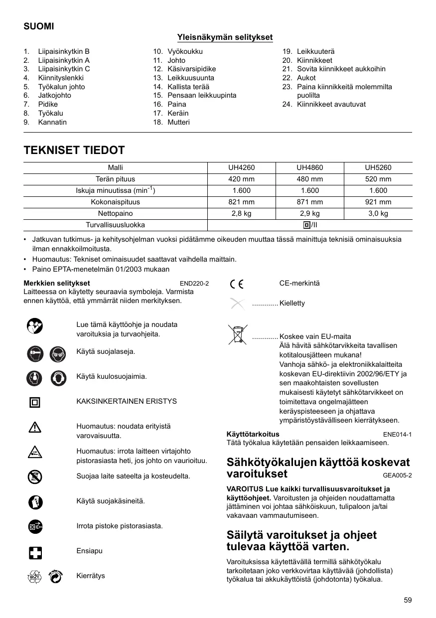 - Paino EPTA-menetelmän 01/2003 mukaan END220-2 Merkkien selitykset Laitteessa on käytetty seuraavia symboleja. Varmista ennen käyttöä, että ymmärrät niiden merkityksen. Lue tämä käyttöohje ja noudata varoituksia ja turvaohjeita. Käytä suojalaseja. Käytä kuulosuojaimia. KAKSINKERTAINEN ERISTYS Huomautus: noudata erityistä varovaisuutta. Huomautus: irrota laitteen virtajohto pistorasiasta heti, jos johto on vaurioituu. Suojaa laite sateelta ja kosteudelta. Käytä suojakäsineitä. Irrota pistoke pistorasiasta. CE-merkintä ............. Kielletty ............. Koskee vain EU-maita Älä hävitä sähkötarvikkeita tavallisen kotitalousjätteen mukana! Vanhoja sähkö- ja elektroniikkalaitteita koskevan EU-direktiivin 2002/96/ETY ja sen maakohtaisten sovellusten mukaisesti käytetyt sähkötarvikkeet on toimitettava ongelmajätteen keräyspisteeseen ja ohjattava ympäristöystävälliseen kierrätykseen. ENE014-1 Käyttötarkoitus Tätä työkalua käytetään pensaiden leikkaamiseen. Sähkötyökalujen käyttöä koskevat varoitukset GEA005-2 VAROITUS Lue kaikki turvallisuusvaroitukset ja käyttöohjeet. Varoitusten ja ohjeiden noudattamatta jättäminen voi johtaa sähköiskuun, tulipaloon ja/tai vakavaan vammautumiseen. Ensiapu Säilytä varoitukset ja ohjeet tulevaa käyttöä varten. Kierrätys Varoituksissa käytettävällä termillä sähkötyökalu tarkoitetaan joko verkkovirtaa käyttävää (johdollista) työkalua tai akkukäyttöistä (johdotonta) työkalua.