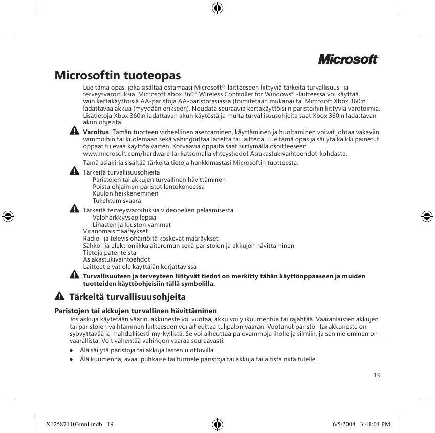Microsoft Microsoftin tuoteopas Lue tämà opas,joka sisältéà ostamaasi Microsoft" -laitteeseen littyviä tärkeità turvallisuus- ja terveysvaraitulsia. Microsoft Xbox 360” Wireless Controller for Windows” -latteessa voi käyttäaà vain kertakäyttoisia AA-paristoja AA-paristorasiassa (taimitetaan mukana) tai Microsoft Xbox 360:n ladattavaa akkua (myydéan erikseer). Noudata seuraavia kertakäyttôisin paristoihin littyvià varotoimia Lisätietoja Xbox 360: ladattavan akun käytôstä ja muita turvallisuusohjeita sat Xbox 360:n ladattavan akun ohjeista À varoitus Tämän tuotteen virheellinen asentaminen, käyttäminen ja huoltaminen voivat johtaa vakaviin vammoihin tai kuolemaan sekà vahingoittas laïtetta tai latteita. Lue tämà opas ja sailytà kaikki painetut cppaat tulevea käyttôä varten. Korvaavia oppaita sat sirtymällà osoitteeseen wuvemicrosoft.com/hardware tai katsomalla yhteystiedot Asiakastukivaihtoehdot-kohdasta Tämà asiakirja sisältäà tärkeità tietoja hankkimastasi Microsoftin tuotteesta À rérkeits turvallisuusonjeita Paristojen tai akkujen turvallinen hävittäminen Poista ohjaimen paristot lentokoneessa Kuulon heikkeneminen Tükehtumisvaara À rérkcita terveysvaroituksia videopelien pelsamisesta Valoherkkeyysepilepsia Lihasten j luuston vammat Viranomaisrméaraykset Radio- ja televisiohäiibità koskevat määräykset Sähko- ja elektronikkalaiteromun sekà parstojen ja akkujen hävittäminen Tietoja patenteista Asiakastukivaihtoëhdot Laitteet evat ole käyttäjän korattavissa Turvallisuuteen ja terveyte tuotteiden käyttôohj tyvät tiedot on merkitty tähän käyttéoppaaseen ja muiden à symbol À Tärkeitä turvallisuusohjeita Paristojen tai akkujen turvallinen hävittäminen Jos akkuja käytetään väärin, akkuneste voi vuotaa, akku voi ylikuumentua tai räjähtää. Vääränlaisten akkujen tai paristojen vaihtaminen laitteeseen voi aiheuttea tulipalon vaaran. Vuotanut paristo- tai akkuneste on syévyttävéà ja mahdollisesti myrkyllisté. Se voi aiheuttaa palovammoja iholle ja silmiin, ja sen nieleminen on vaarallista. Voit véhentäà vahingon vaaraa seuraavasti + Àlà säilytà paristoja tai akkuja lasten ulottuvilla + Àlä kuumenna, avaë, puhkaise tai turmele paristoja tai akkuja tai altista ni tulelle.