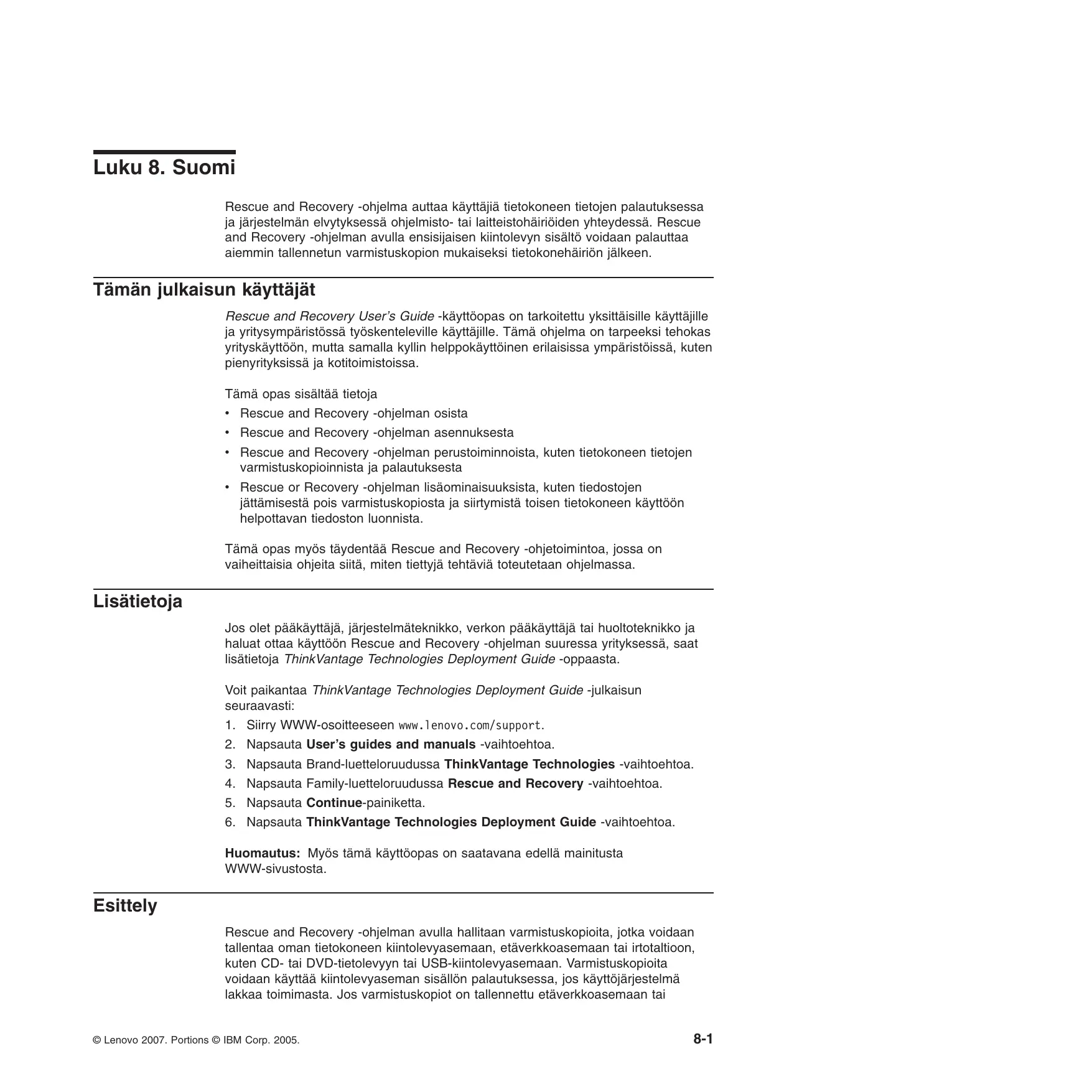 7-10 Rescue and Recovery™ Handboek voor de gebruiker Luku 8. Suomi Rescue and Recovery -ohjelma auttaa käyttäjiä tietokoneen tietojen palautuksessa ja järjestelmän elvytyksessä ohjelmisto- tai laitteistohäiriöiden yhteydessä. Rescue and Recovery -ohjelman avulla ensisijaisen kiintolevyn sisältö voidaan palauttaa aiemmin tallennetun varmistuskopion mukaiseksi tietokonehäiriön jälkeen. Tämän julkaisun käyttäjät Rescue and Recovery User’s Guide -käyttöopas on tarkoitettu yksittäisille käyttäjille ja yritysympäristössä työskenteleville käyttäjille. Tämä ohjelma on tarpeeksi tehokas yrityskäyttöön, mutta samalla kyllin helppokäyttöinen erilaisissa ympäristöissä, kuten pienyrityksissä ja kotitoimistoissa. Tämä opas sisältää tietoja v Rescue and Recovery -ohjelman osista v Rescue and Recovery -ohjelman asennuksesta v Rescue and Recovery -ohjelman perustoiminnoista, kuten tietokoneen tietojen varmistuskopioinnista ja palautuksesta v Rescue or Recovery -ohjelman lisäominaisuuksista, kuten tiedostojen jättämisestä pois varmistuskopiosta ja siirtymistä toisen tietokoneen käyttöön helpottavan tiedoston luonnista. Tämä opas myös täydentää Rescue and Recovery -ohjetoimintoa, jossa on vaiheittaisia ohjeita siitä, miten tiettyjä tehtäviä toteutetaan ohjelmassa. Lisätietoja Jos olet pääkäyttäjä, järjestelmäteknikko, verkon pääkäyttäjä tai huoltoteknikko ja haluat ottaa käyttöön Rescue and Recovery -ohjelman suuressa yrityksessä, saat lisätietoja ThinkVantage Technologies Deployment Guide -oppaasta. Voit paikantaa ThinkVantage Technologies Deployment Guide -julkaisun seuraavasti: