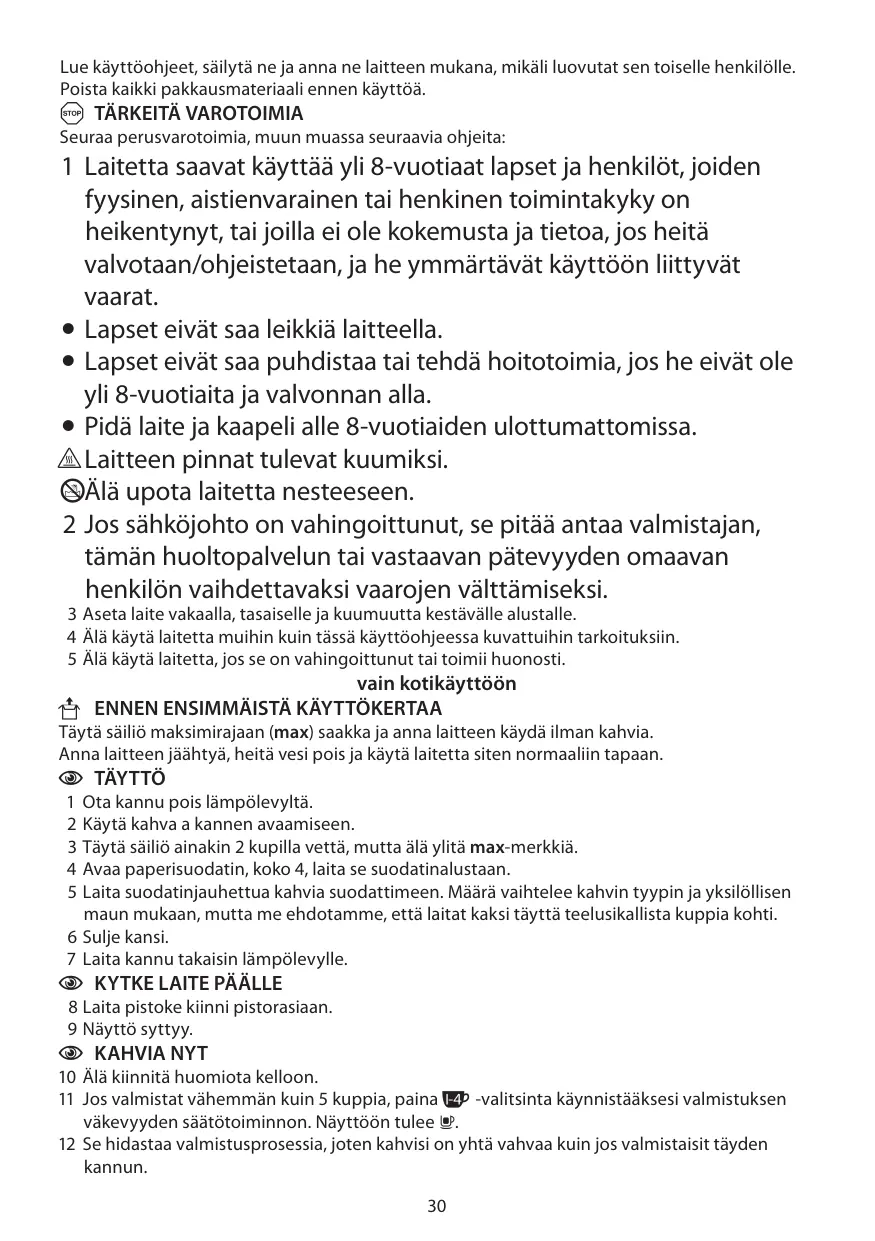- Pidä laite ja kaapeli alle 8-vuotiaiden ulottumattomissa. h Laitteen pinnat tulevat kuumiksi. lÄlä upota laitetta nesteeseen. 2 Jos sähköjohto on vahingoittunut, se pitää antaa valmistajan, tämän huoltopalvelun tai vastaavan pätevyyden omaavan henkilön vaihdettavaksi vaarojen välttämiseksi. 3 Aseta laite vakaalla, tasaiselle ja kuumuutta kestävälle alustalle. 4 Älä käytä laitetta muihin kuin tässä käyttöohjeessa kuvattuihin tarkoituksiin. 5 Älä käytä laitetta, jos se on vahingoittunut tai toimii huonosti. vain kotikäyttöön U ENNEN ENSIMMÄISTÄ KÄYTTÖKERTAA Täytä säiliö maksimirajaan (max) saakka ja anna laitteen käydä ilman kahvia. Anna laitteen jäähtyä, heitä vesi pois ja käytä laitetta siten normaaliin tapaan.