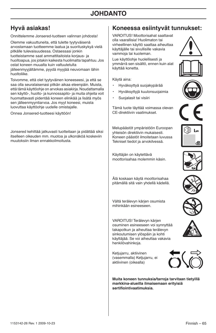 Nous sommes persuadés que vous apprécierez la qualité et les performances de nos produits pendant de longues années. L’achat d’un de nos produits vous garantit une assistance professionnelle au niveau du service et des réparations en cas de besoin. Si la machine n’a pas été achetée chez un de nos revendeurs autorisés, demandez à un revendeur l’adresse de l’atelier d’entretien le plus proche. Nous espérons que cette machine vous donnera toute satisfaction et qu’elle vous accompagnera pendant de longues années. N’oubliez pas que ce manuel d’utilisation est important. En suivant les instructions qu’il contient (utilisation, révision, entretien, etc.), il est possible d’allonger considérablement la durée de vie de la machine et d’augmenter sa valeur sur le marché de l’occasion. En cas de vente de la machine, ne pas oublier de remettre le manuel d’utilisation au nouveau propriétaire. Bonne chance avec votre nouveau produit Jonsered!